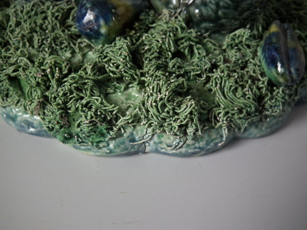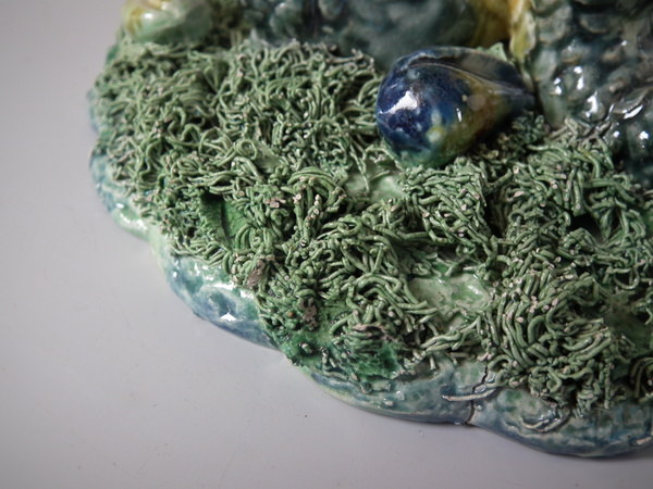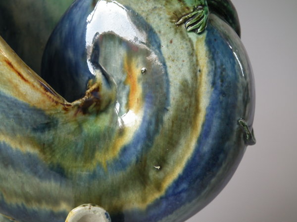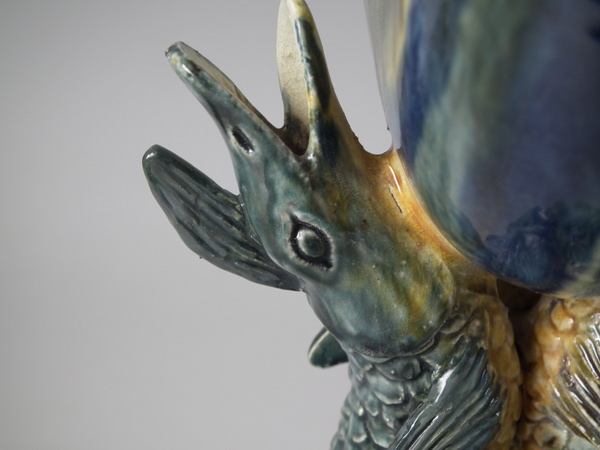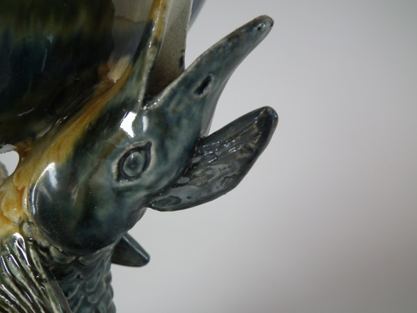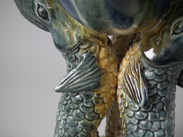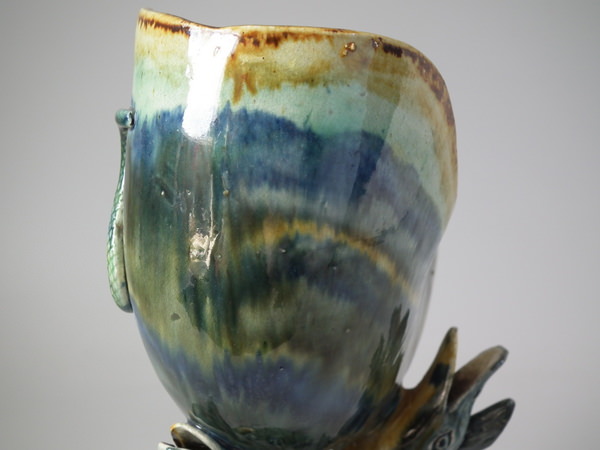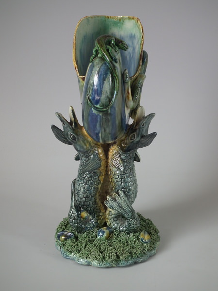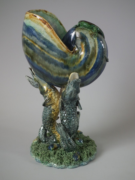 Majolica Palissy fish supporting Nautilus shell vase