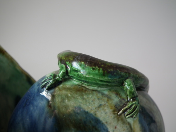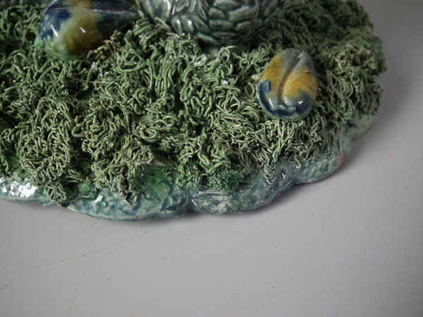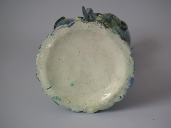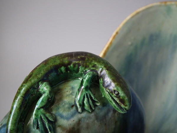 Victorian, circa 1890. 10.4ins high, 5.9ins wide, 5.1ins depth. Portuguese Palissy Majolica vase which features a small lizard and snake resting on a nautilus shell,
