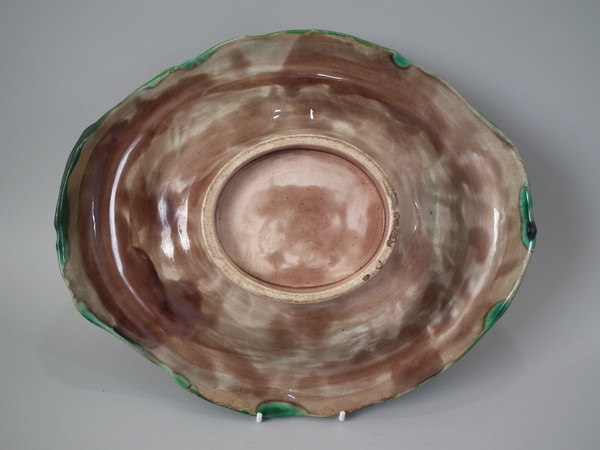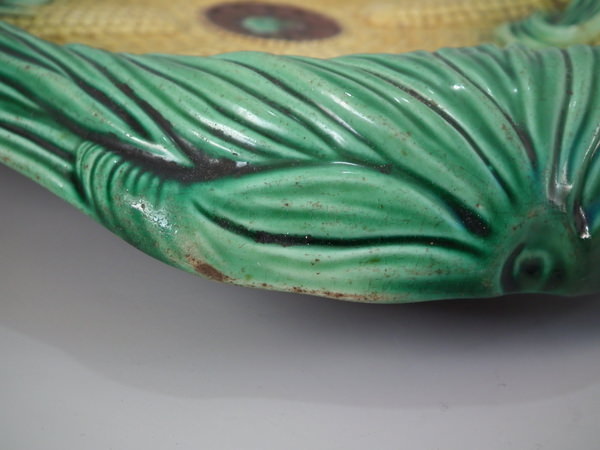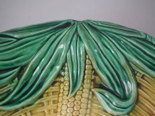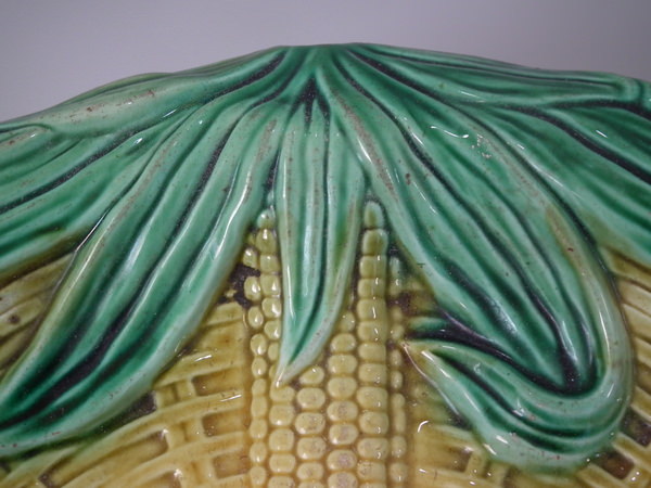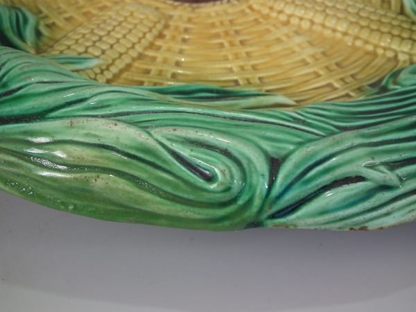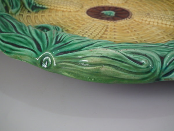 Victorian, circa 1870. 2.4ins high, 13ins wide, 11ins depth. Majolica bread platter which features four corn cobs laid in a basket.
