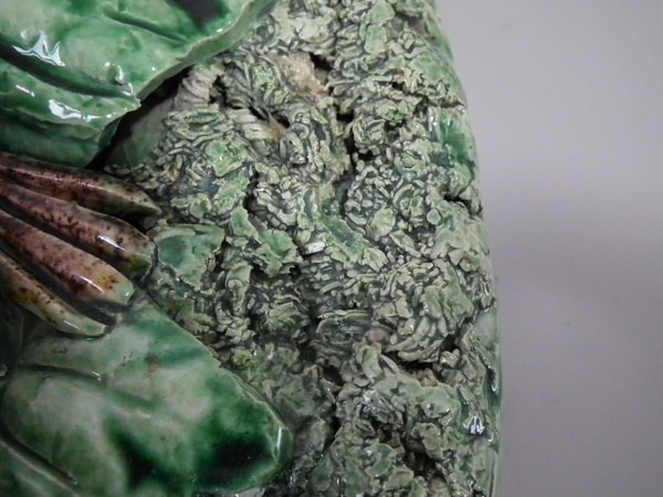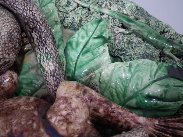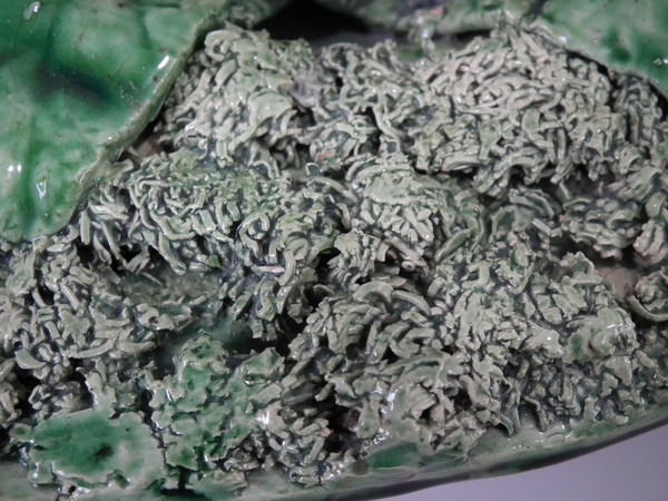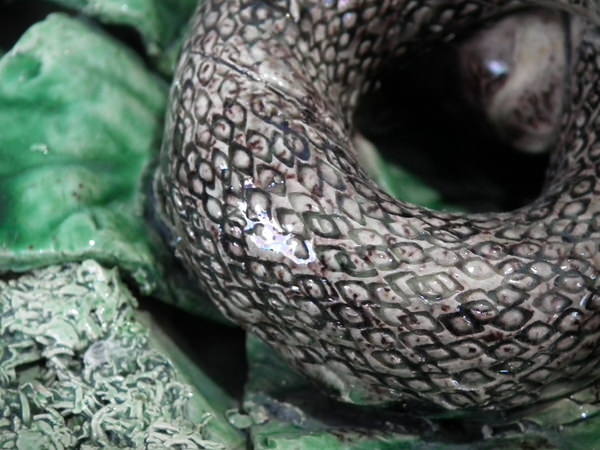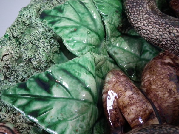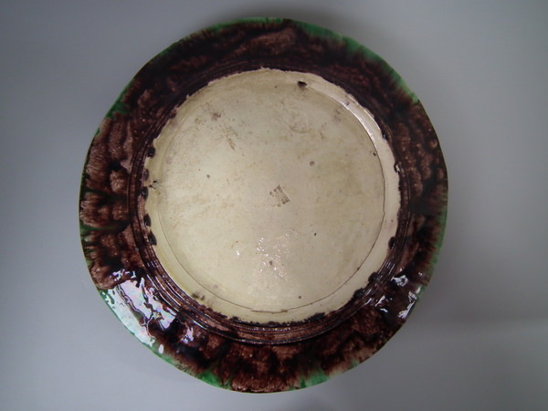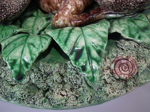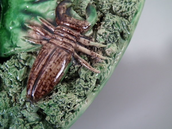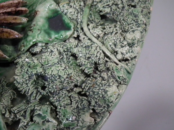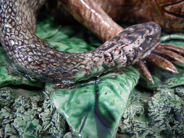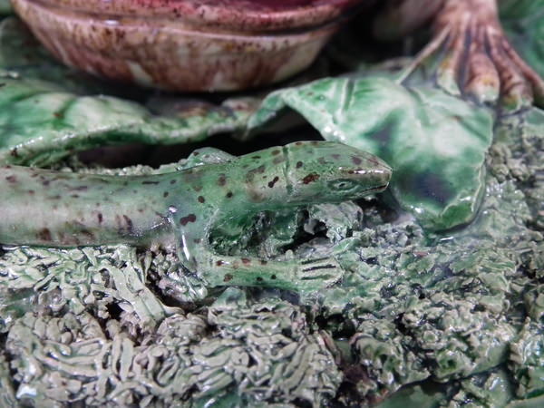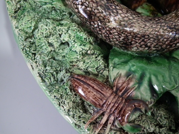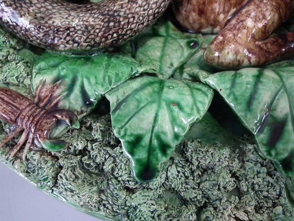 Victorian, circa 1890. 3.3ins high, 15.4ins wide, 15.4ins depth. Mafra Majolica wall charger which features a large toad and snake on a leafy ground, surrounded by smaller lizards and insects. Colouration: green, brown, cream, are predominant.