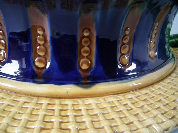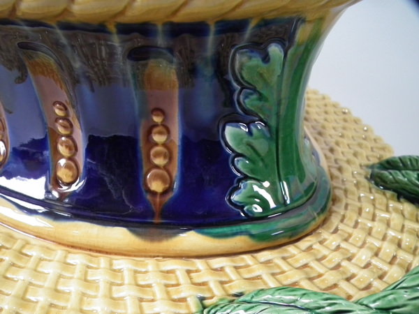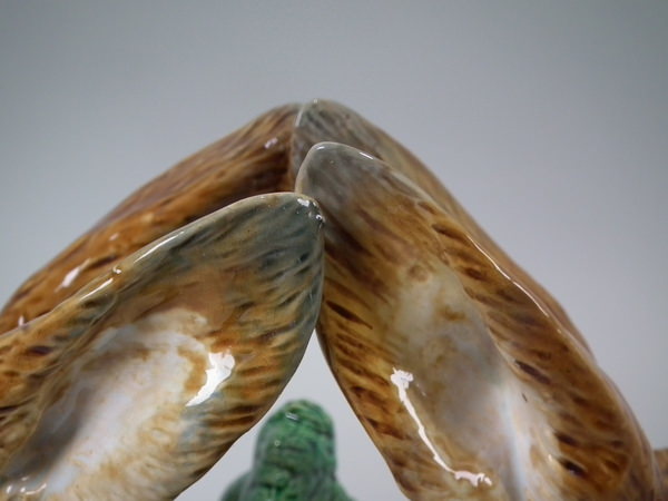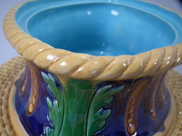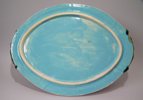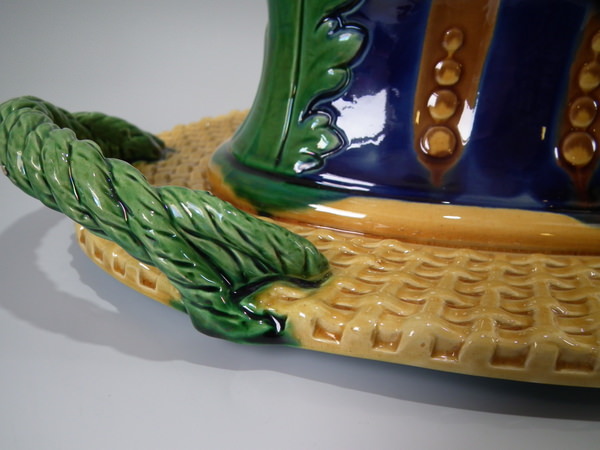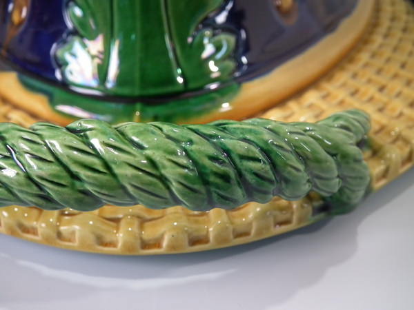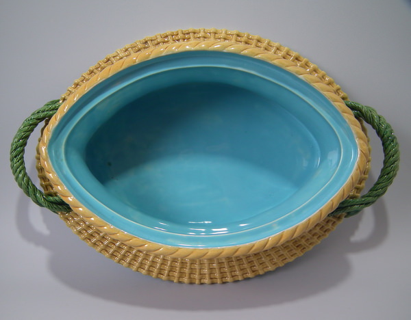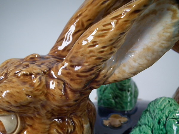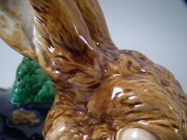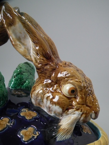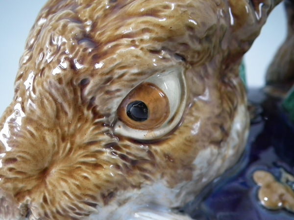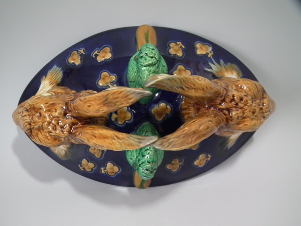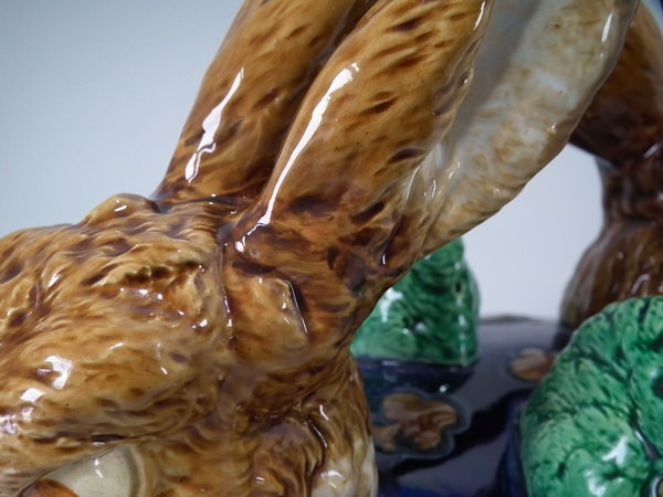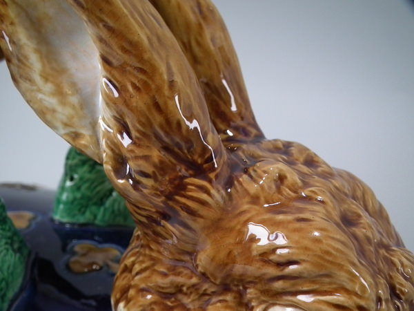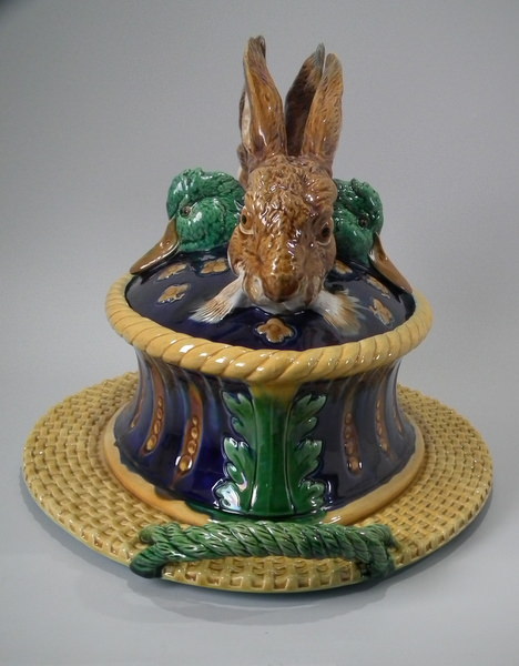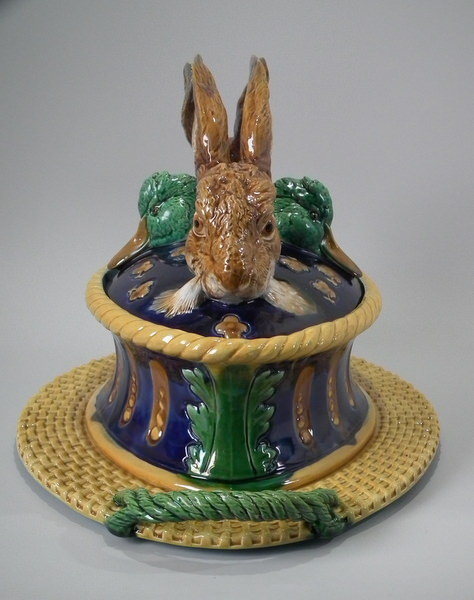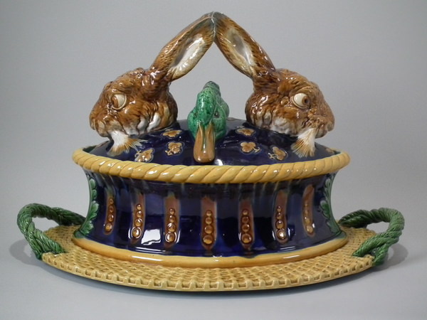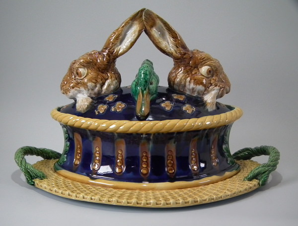 Victorian, circa 1877. 11.4ins high, 18.1ins wide, 13ins depth. Mintons Majolica game pie dish which features two hares