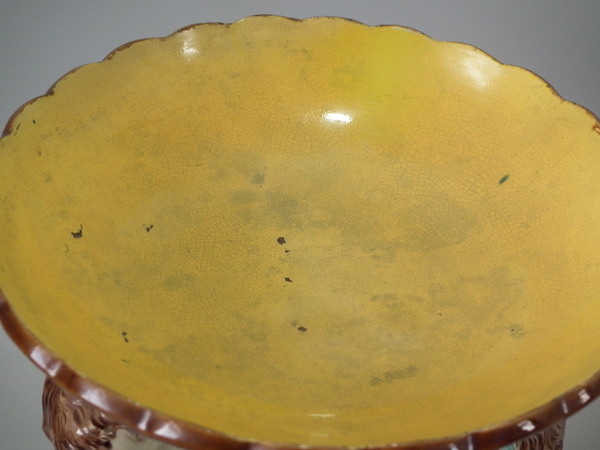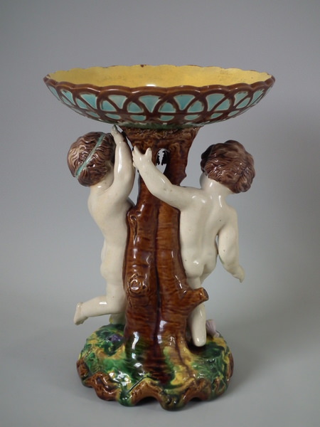 Victorian, circa 1880. 10.7ins high, 7.3ins wide, 7.3ins depth. Majolica compote which features two putti holding grapes.