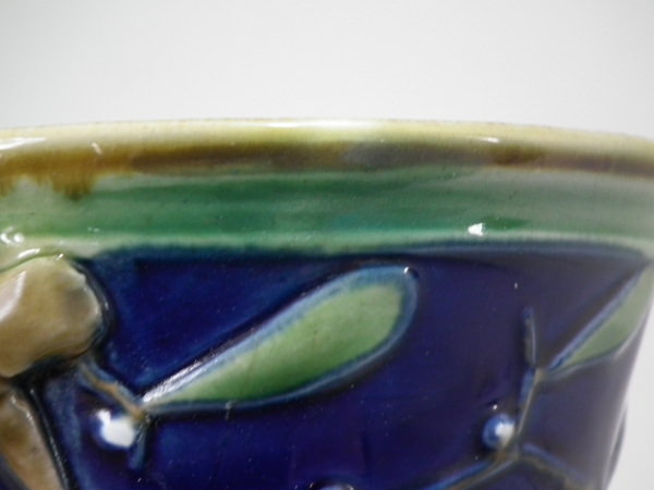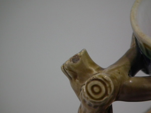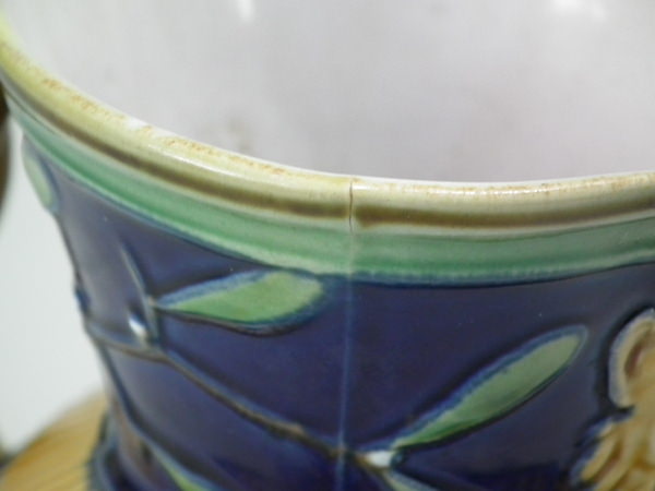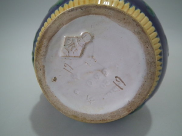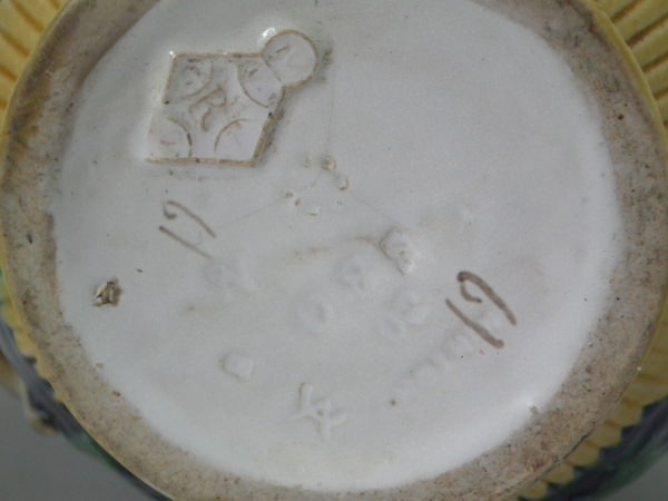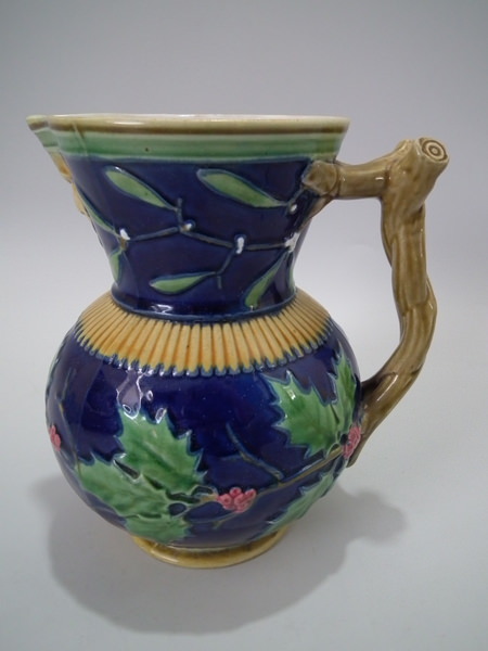 Victorian, circa 1867. 5.7ins high, 4.7ins wide, 3.9ins depth. Minton Majolica jug/pitcher which features holly and mistletoe with a branch handle. Colouration: cobalt blue, green, ochre, are predominant.