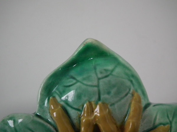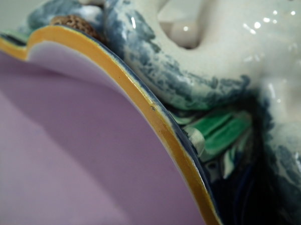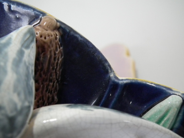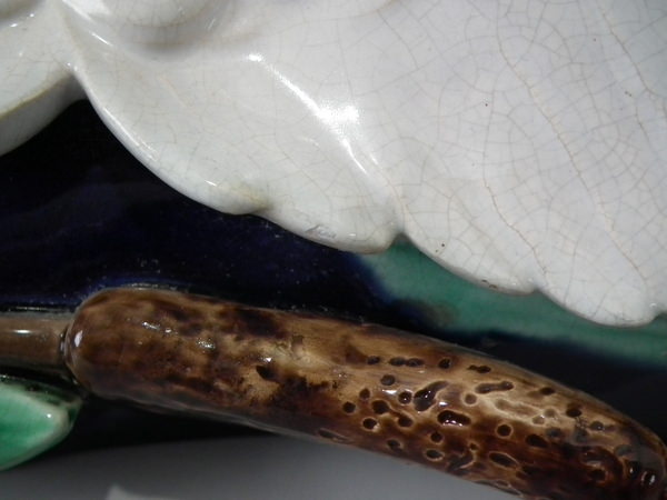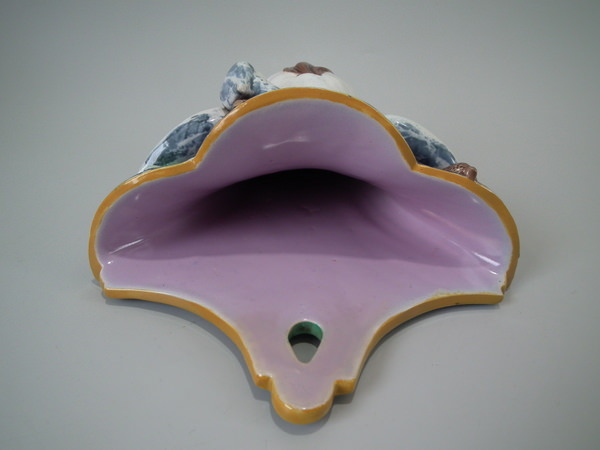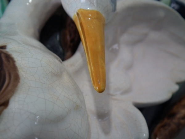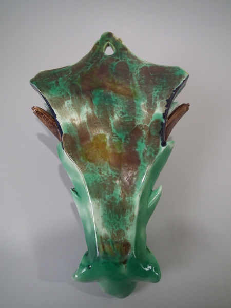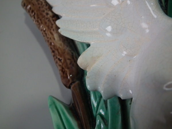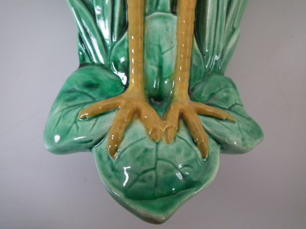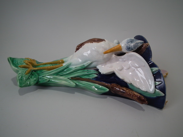 descVictorian, circa 1870. 13ins high, 7.7ins wide, 3.5ins depth. Holdcroft Majolica wall pocket which features a heron stood in front of reeds/bulrushes.