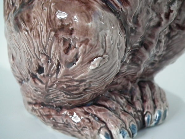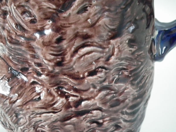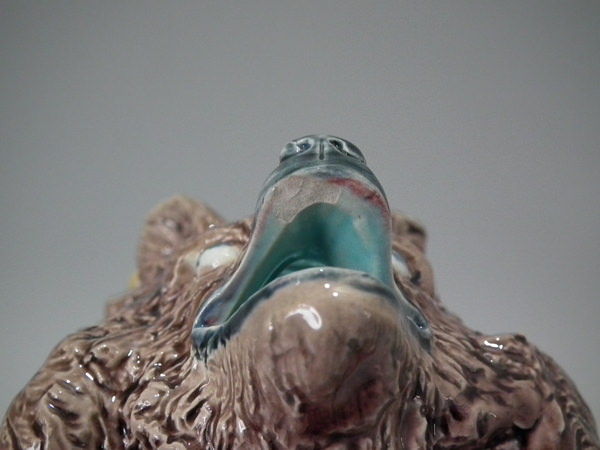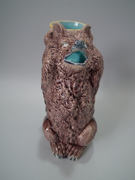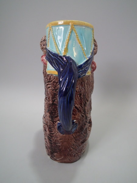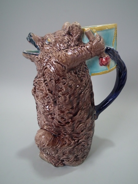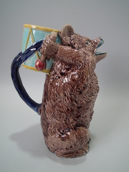 Victorian, circa 1870. 9.6ins high, 7.1ins wide, 3.5ins depth. Holdcroft Majolica jug/pitcher which features a bear holding a drum and drumsticks behind his head. Colouration: brown, turquoise, cobalt blue, are predominant.