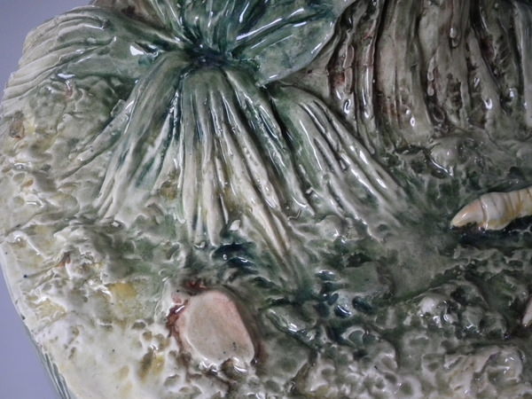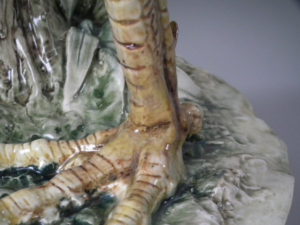Victorian, circa 1900. 29.9ins high, 21.3ins wide, 12.6ins depth. Majolica stick or umbrella stand which features a large cockerel/rooster.