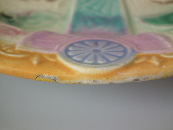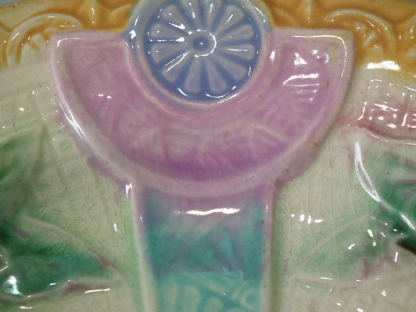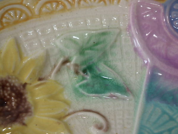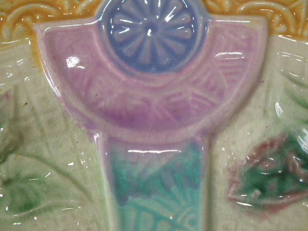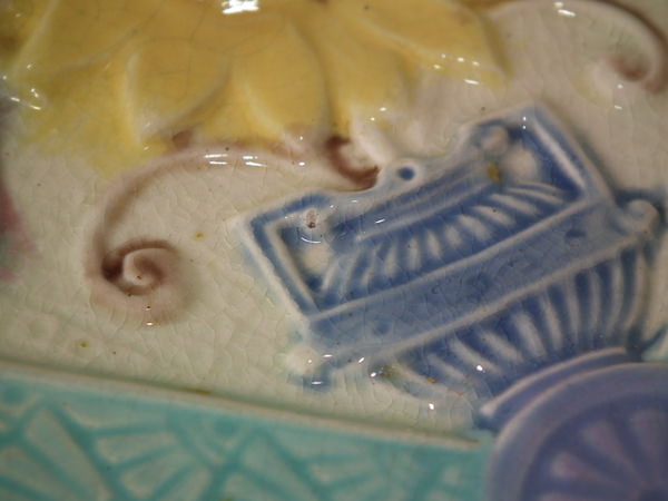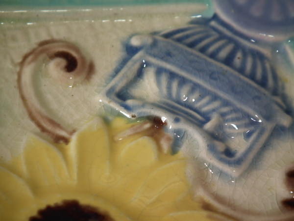 Victorian, circa 1880. 0.9ins high, 7.9ins wide, 7.9ins depth. Lear Majolica plate which features sunflowers in vases. Colouration: ochre, turquoise, cream, are predominant. English diamond registration mark for the date 03/??/??.