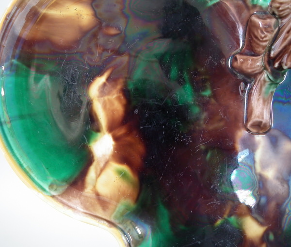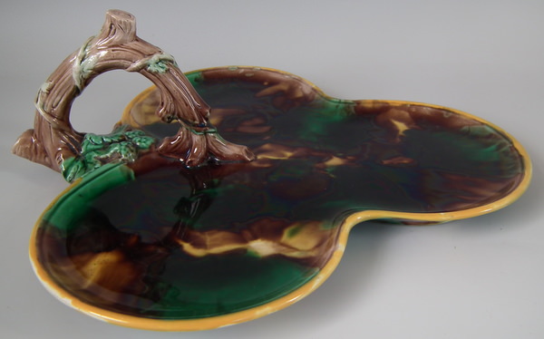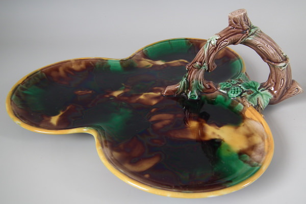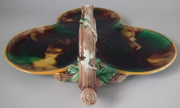 Victorian, circa 1878. 4.3ins high, 10.6ins wide, 11.8ins depth. Wedgwood Majolica tray (part of a set) which features a branch handle.