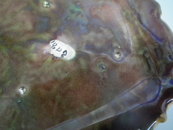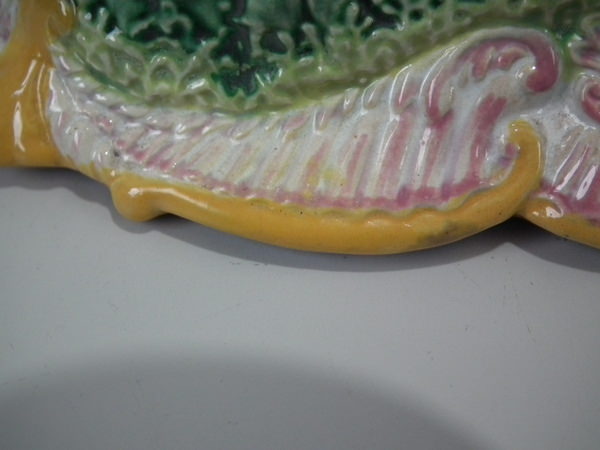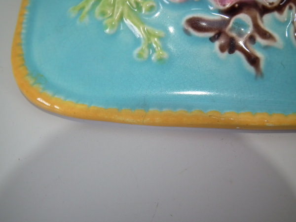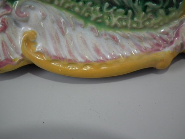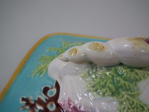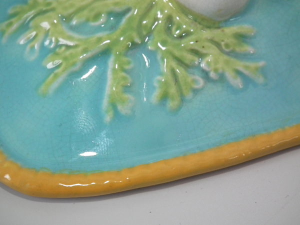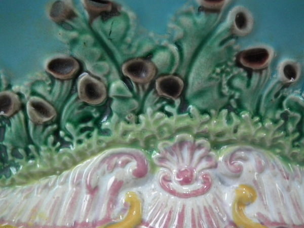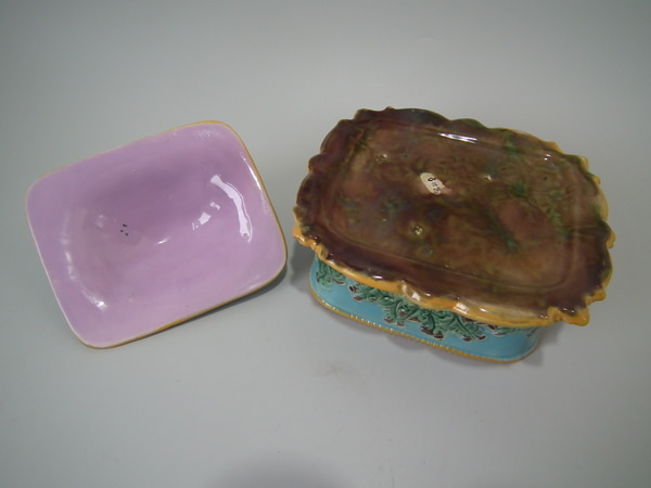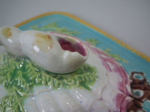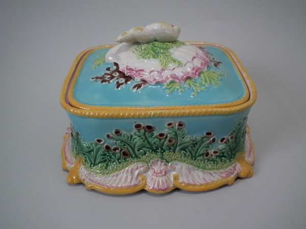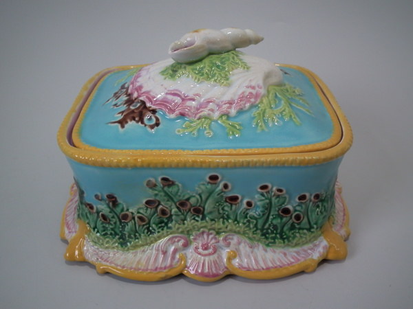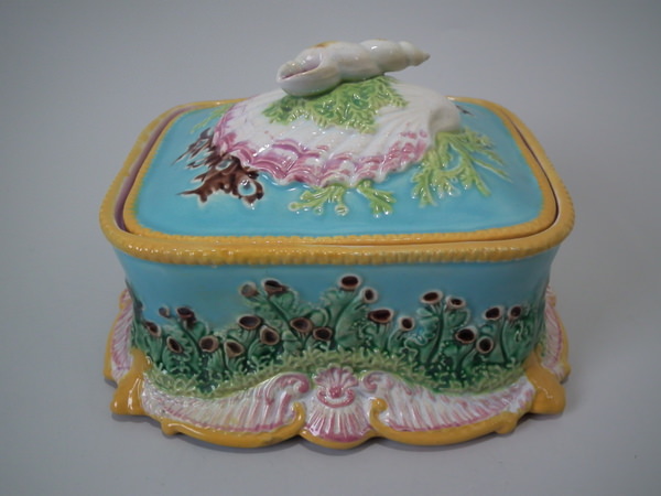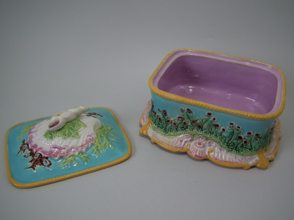 Victorian, circa 1870. 4.3ins high, 5.9ins wide, 6.7ins depth. George Jones Majolica sardine box which features shells and seaweed. Colouration: pink, green, ochre, are predominant.