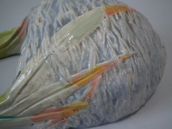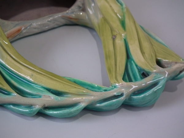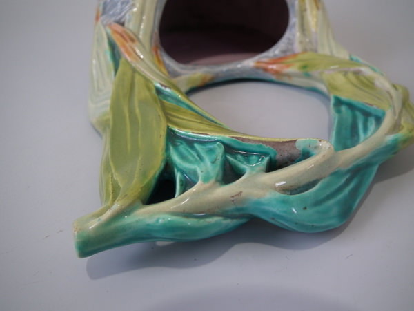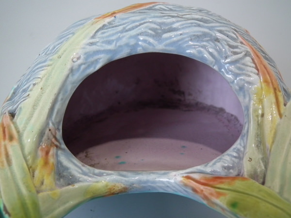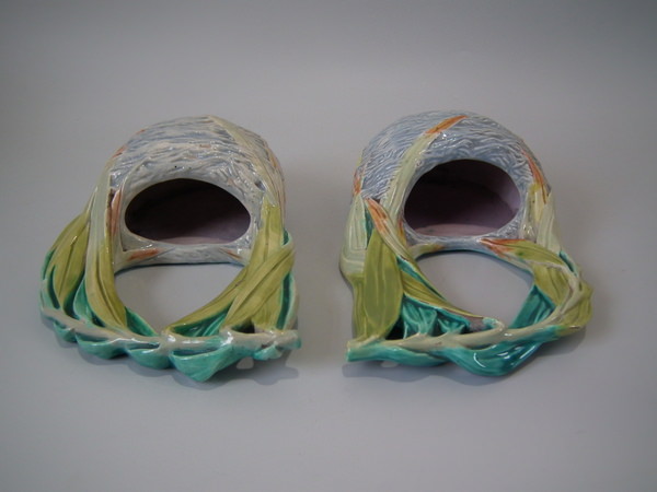 Victorian, circa 1880. Tallest is 8.3ins high, 4.9ins wide, 2.8ins depth. Pair of Royal Worcester Majolica wall pockets which feature a bird's nest.