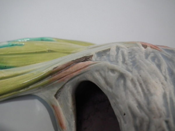 kiln detritus caught in the glaze to one leaf;