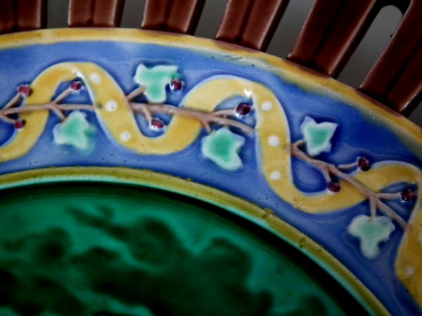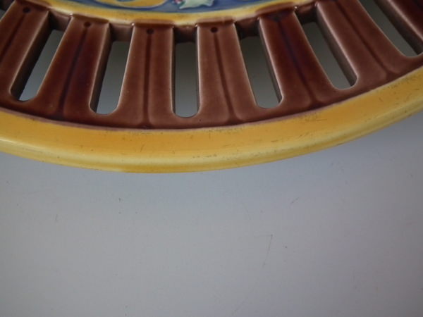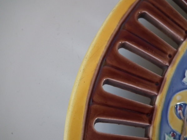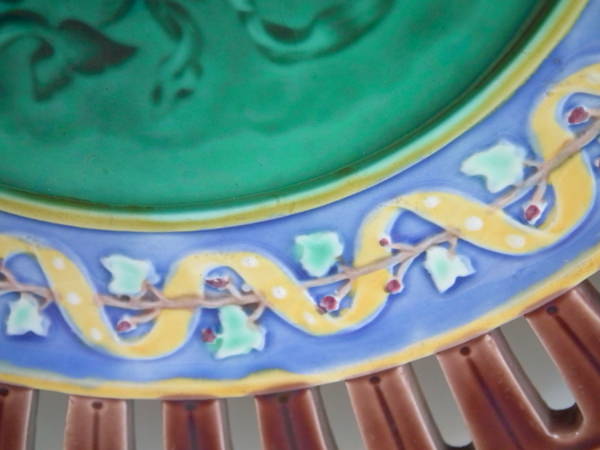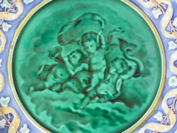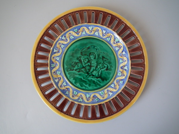 Victorian, circa 1871. 0.9ins high, 8.7ins wide, 8.7ins depth. Wedgwood Majolica which features cherubs playing with a dolphin.