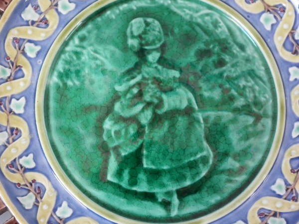 Victorian, circa 1871. 0.9ins high, 8.7ins wide, 8.7ins depth. Wedgwood Majolica plate which features an elegantly dressed lady holding a small dog.