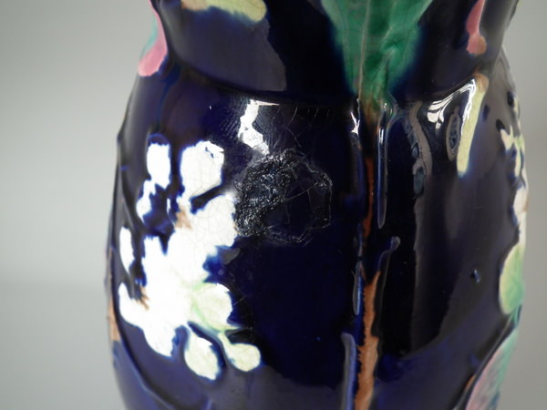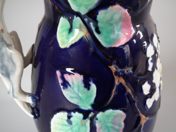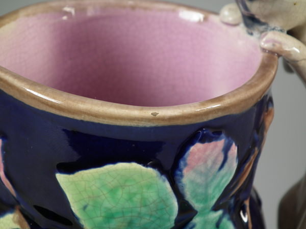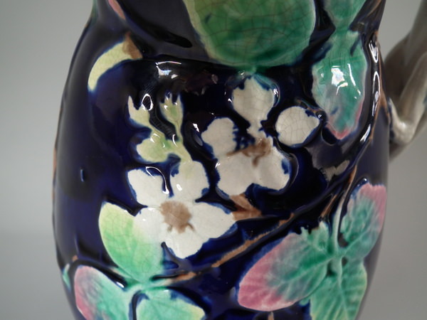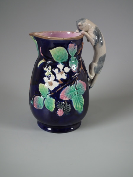 Victorian, circa 1870. 7.9ins high, 5.5ins wide, 4.5ins depth. Majolica jug/pitcher which features blossom and berries and a cat forming the handle.
