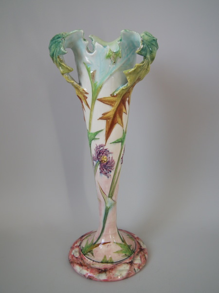 Victorian, circa 1900. 14.2ins high, 5.5ins wide, 5.5ins depth. Delphin Massier Majolica vase which features thistles.