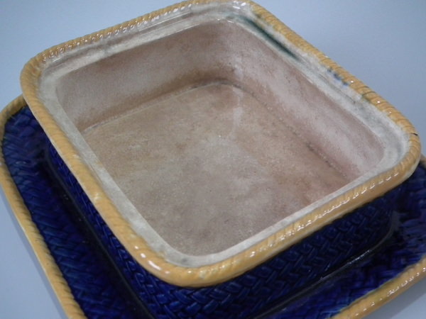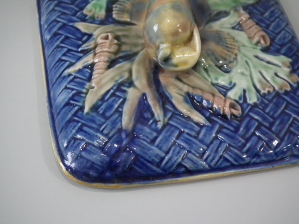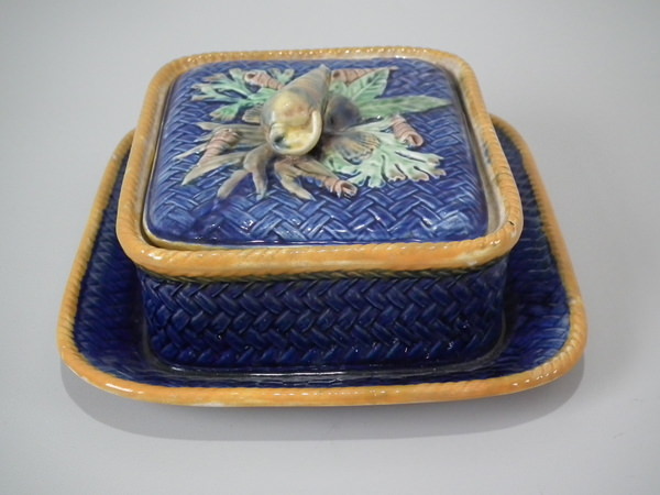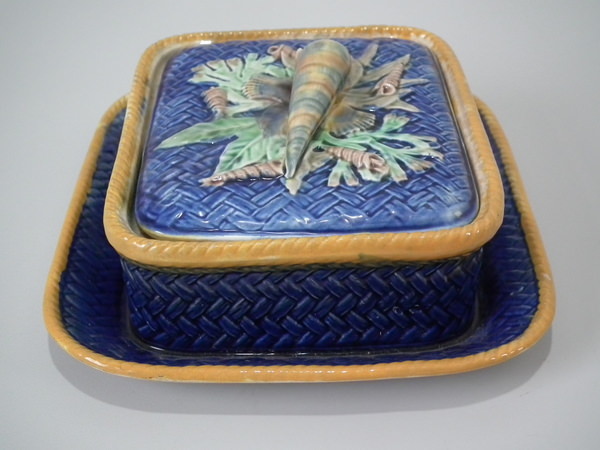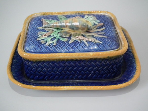 Victorian, circa 1877. 3.3ins high, 7.9ins wide, 7.1ins depth. Wedgwood Majolica sardine box which features shells and seaweed.