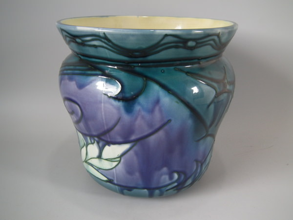 Circa 1910. 9.25 ins high, 10ins wide. Minton Secessionist No.15 jardiniere. Decorated with stylised leaves and black tube linings. Cream ground with blue, purple and green glazes. Ochre interior.
