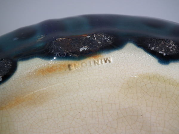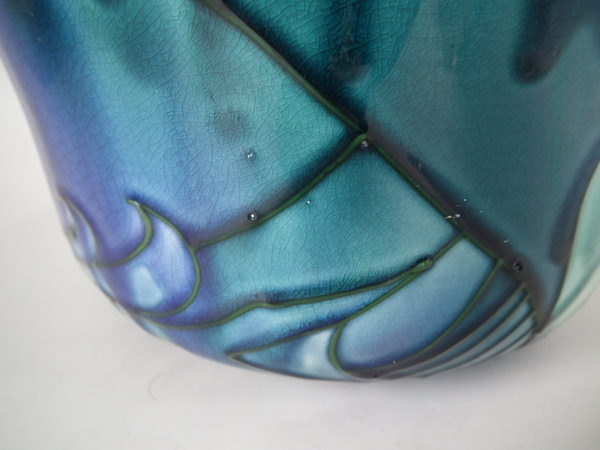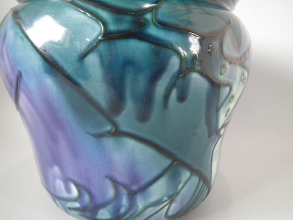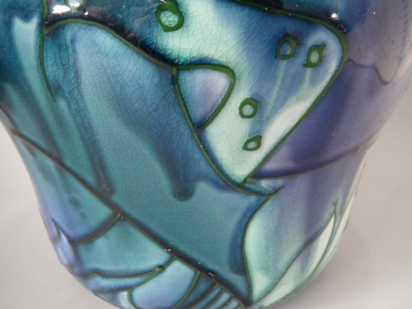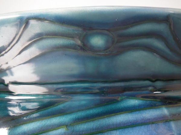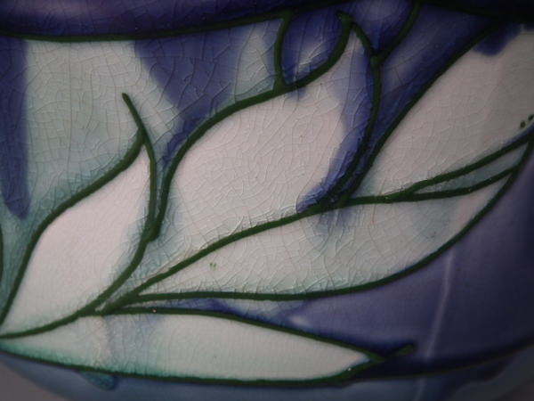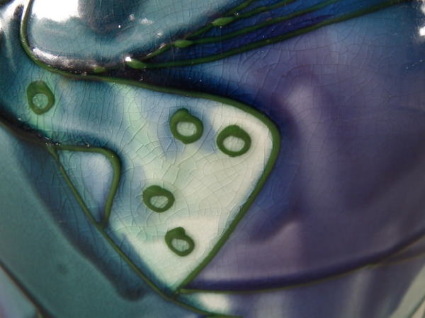 Glaze run to the green and lilac glazes.