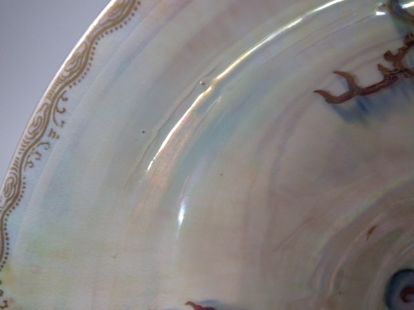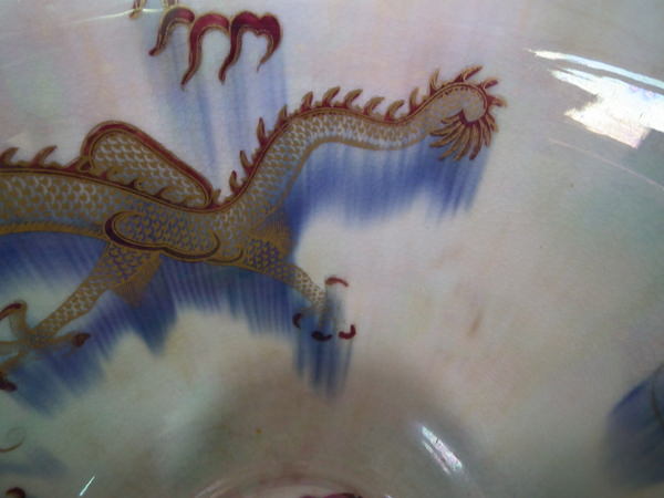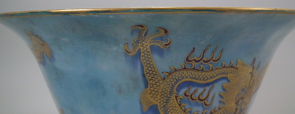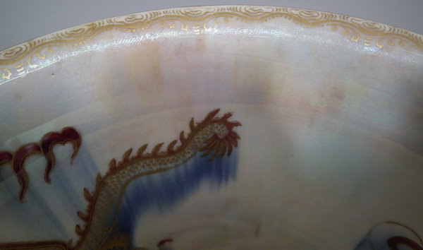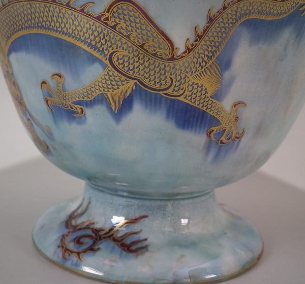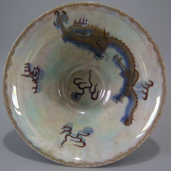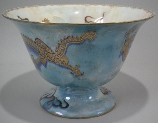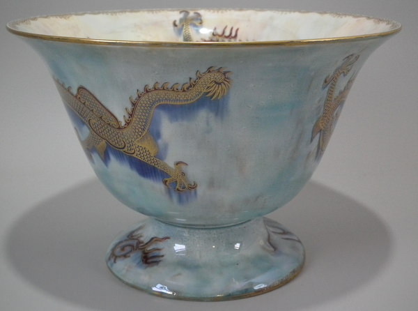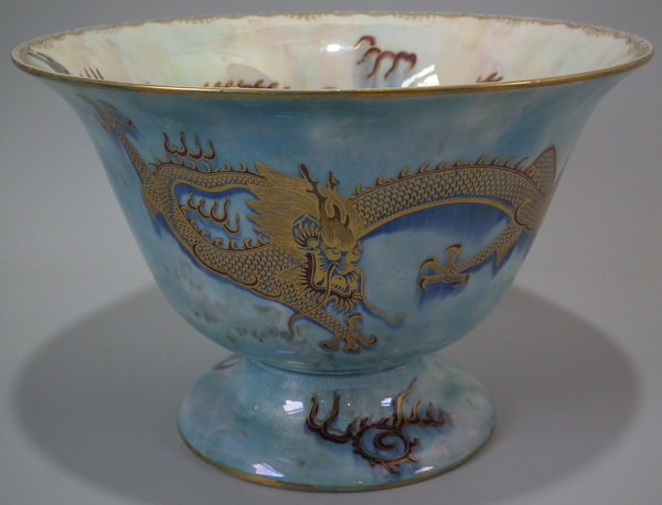 Circa 1910. 5.75ins high, 8.75ins diameter. Wedgwood dragon lustre footed bowl. 'Antique Center' shape no. 2454. Light blue mottled exterior decorated with two celestial dragons and flames. Gilt border around the rim and foot rim. Mother of pearl interior decorated with a fire breathing dragon and 'Sacred Pearl with flames' motifs. Gilt aquatic bead around the inside of the rim.