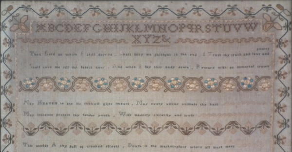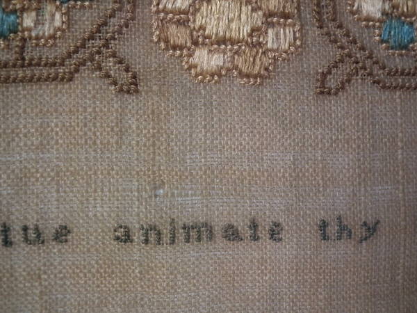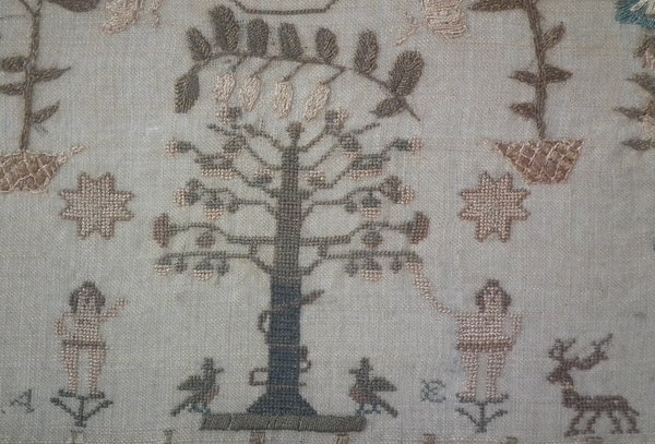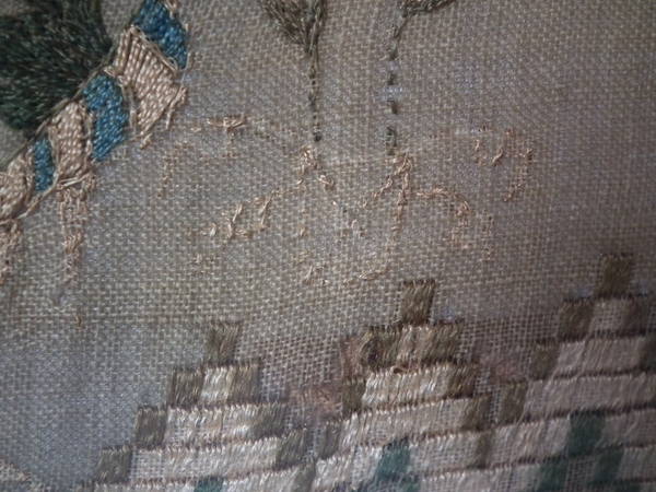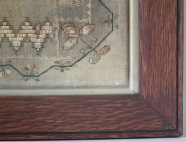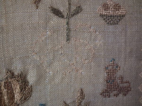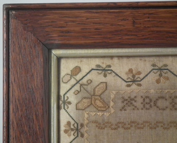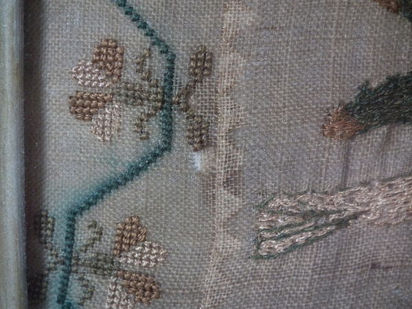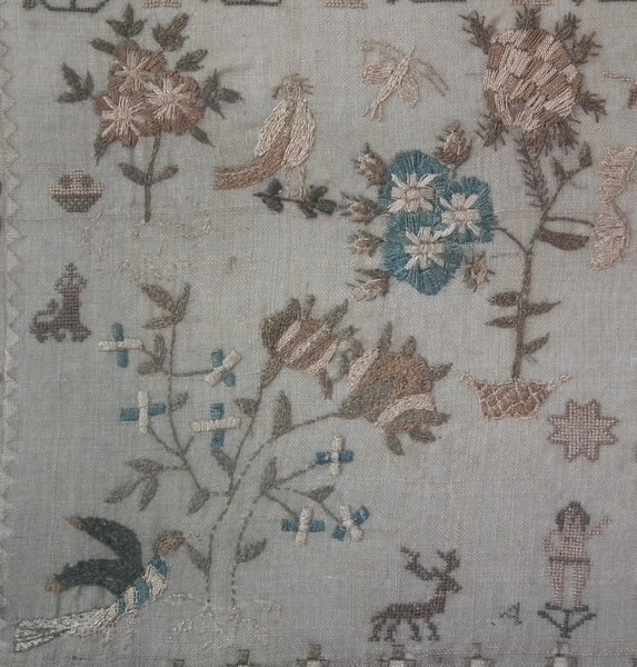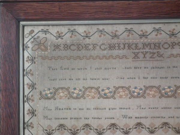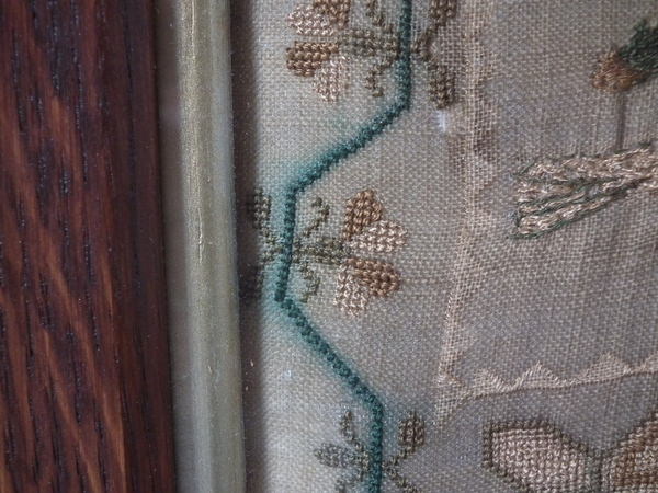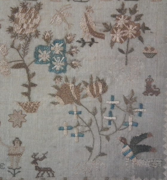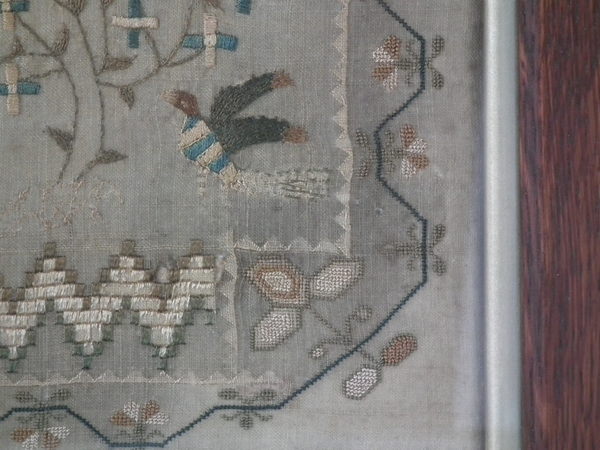 The sampler is worked in silk on linen ground, in a variety of stitches including Algerian eye.