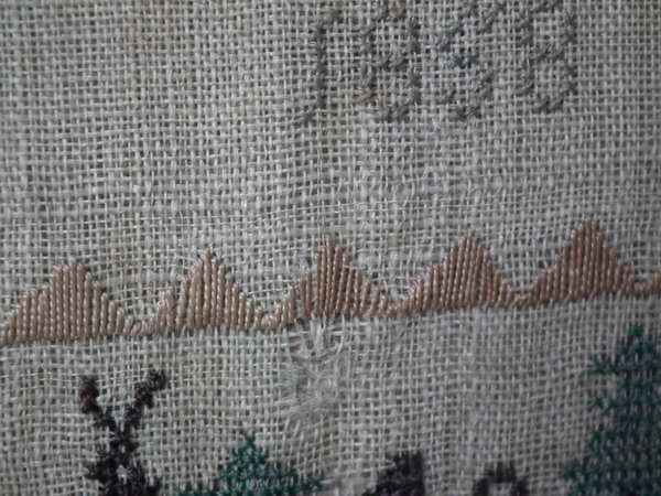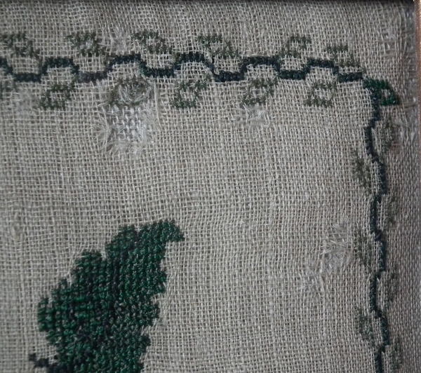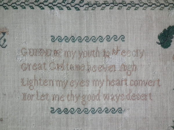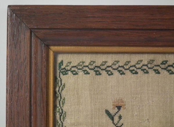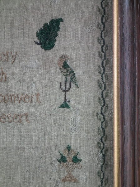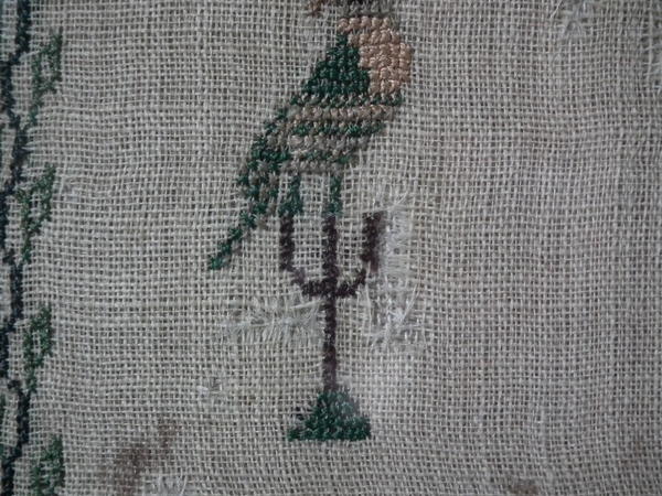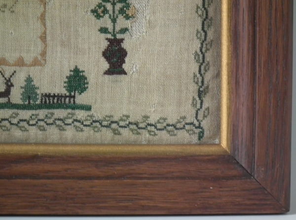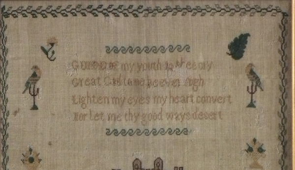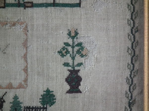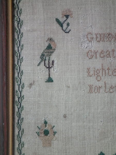 The sampler is worked in silk on canvas ground, in a variety of stitches.