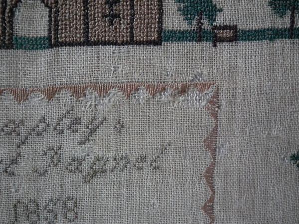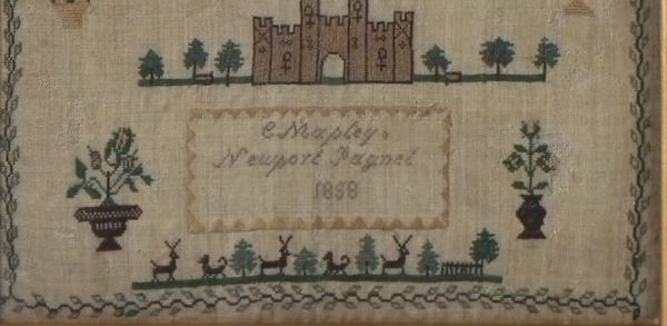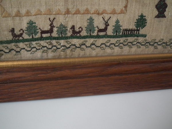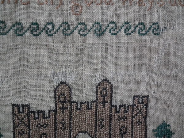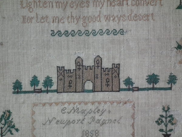 Victorian, dated 1858. 13ins by 12.5ins wide. 1858 Castle Sampler by C Mapley. Framed in an old wood frame with gilt slip and glass.