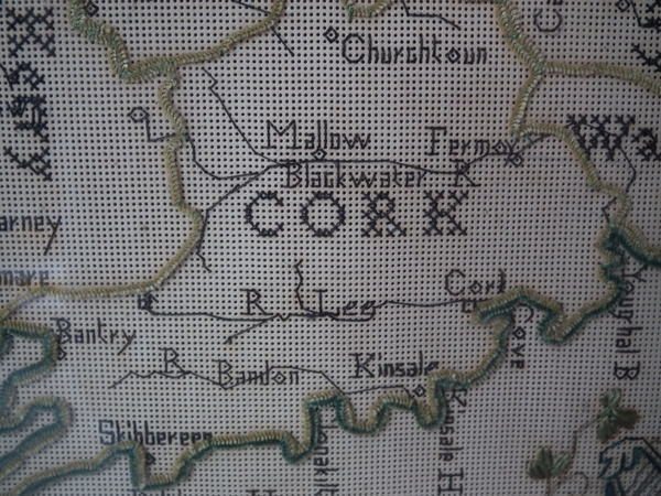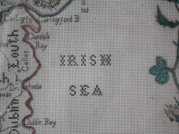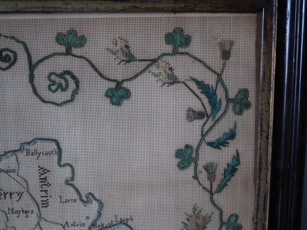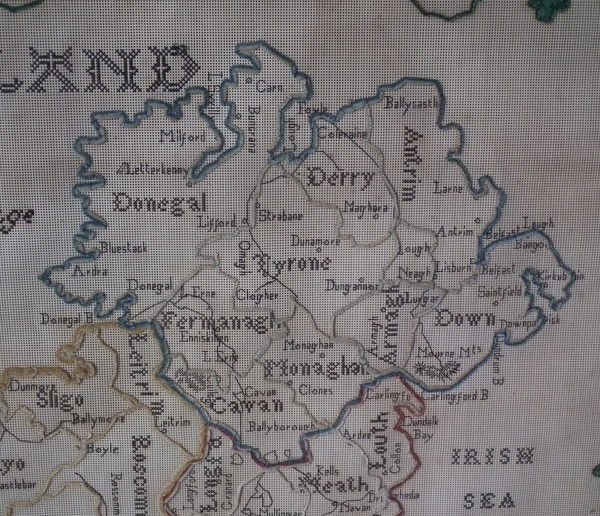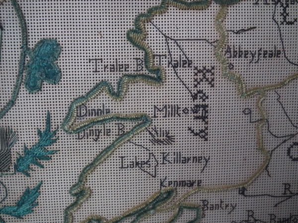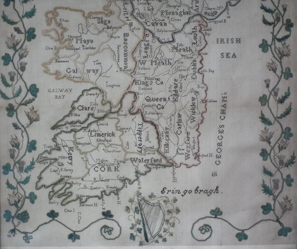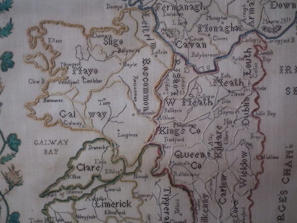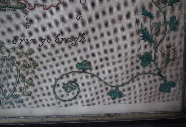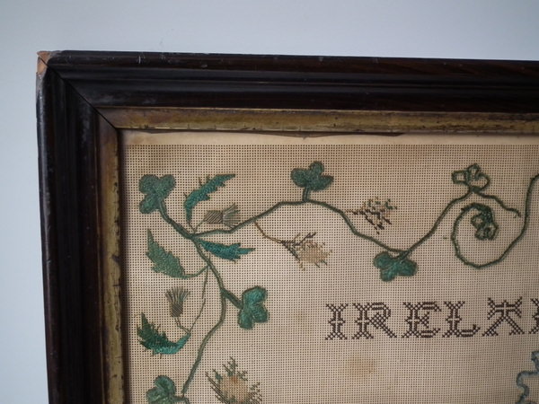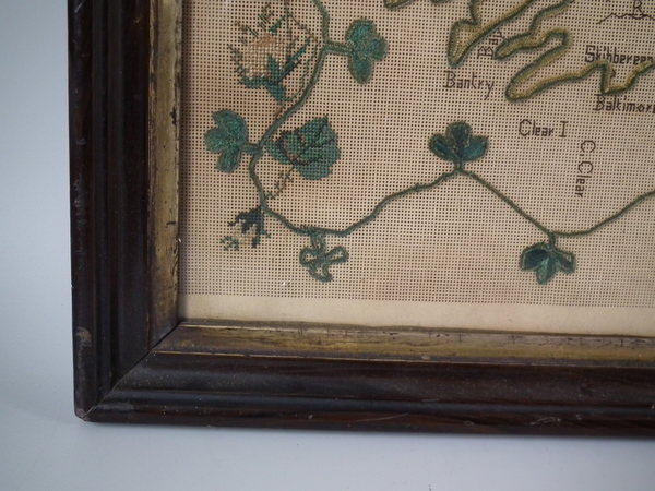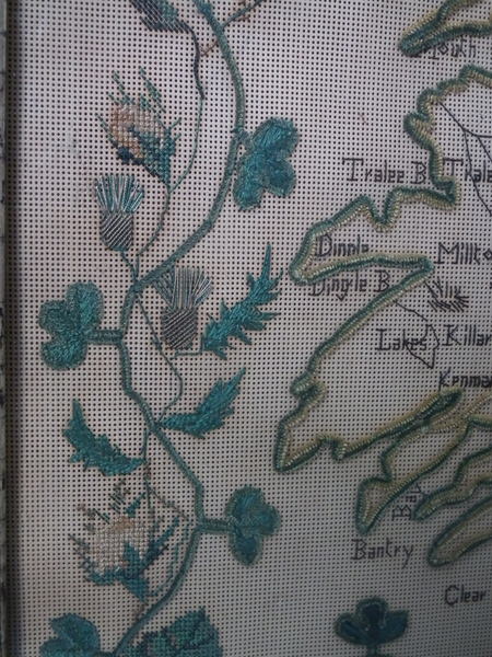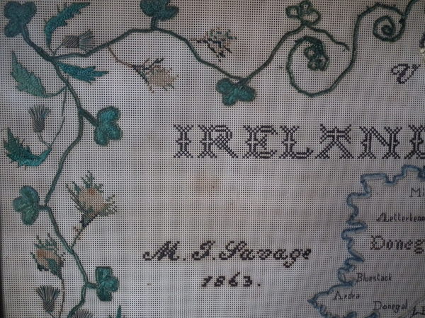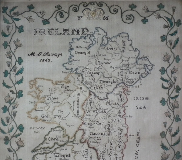 Victorian, dated 1863. 22ins by 18ins wide. 1863 Ireland Map Paper Sampler by M J Savage. Framed in an old wood frame with rippled, old glass.