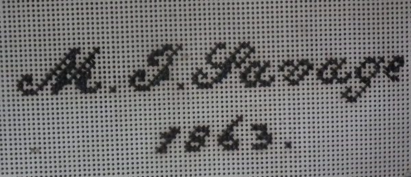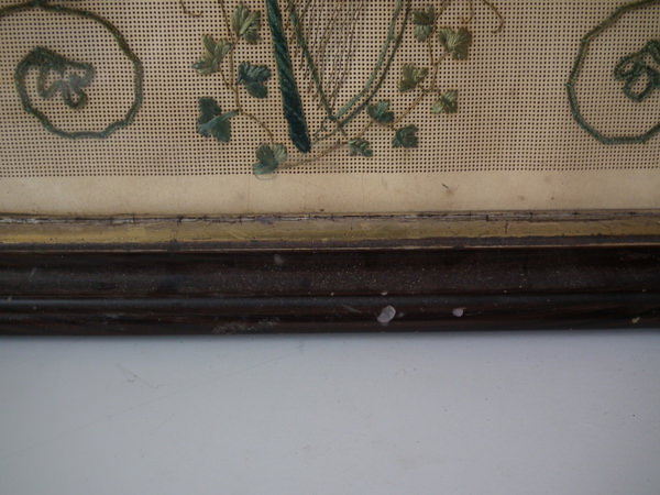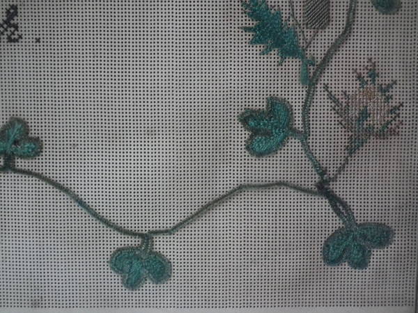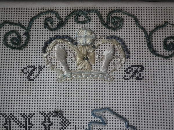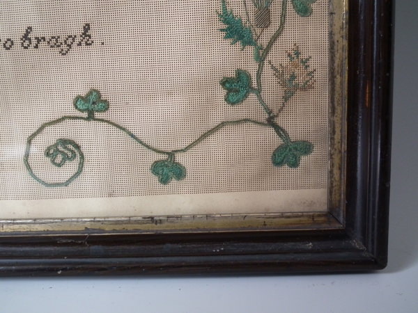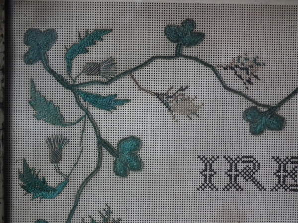 The sampler is worked in a variety of stitches including an unusual wool stitch and silk-like threads on punched paper ground, in a variety of stitches.