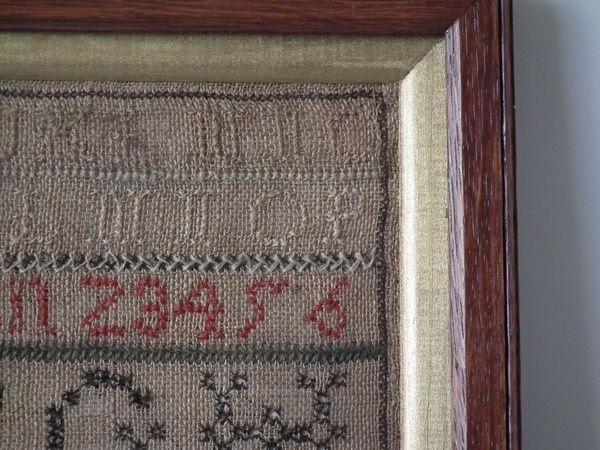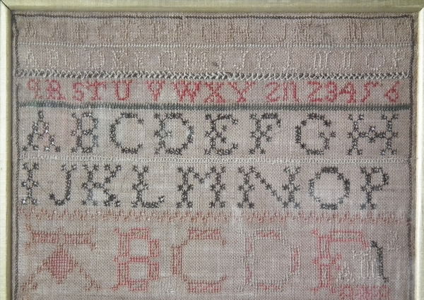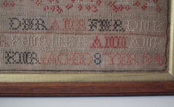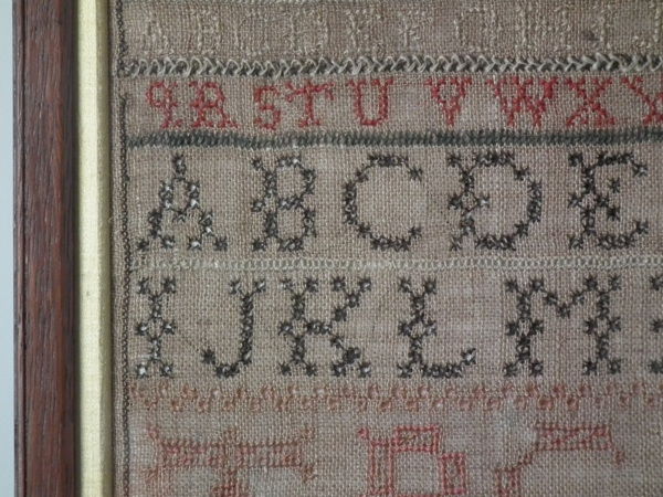 Victorian, dated 1841. 15.75ins by 11.25ins wide. 1841 Alphabet Sampler by KMR. Framed in an old wood frame with gilt slip and glass.