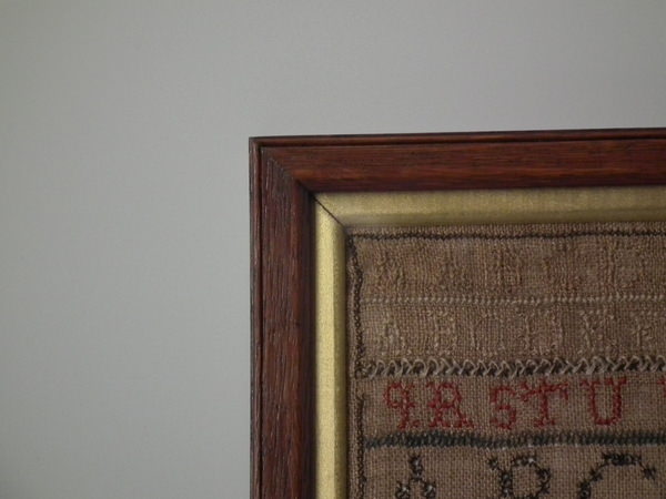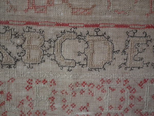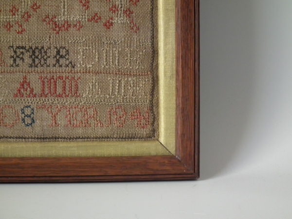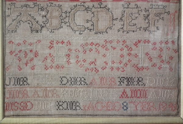 The sampler is worked in fine wool on canvas ground, in a variety of stitches including Algerian eye.