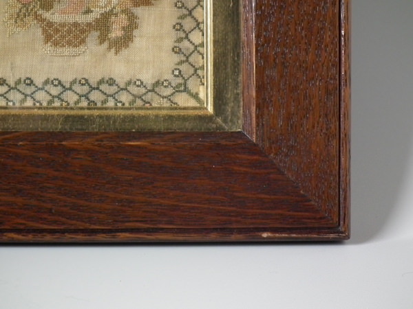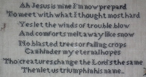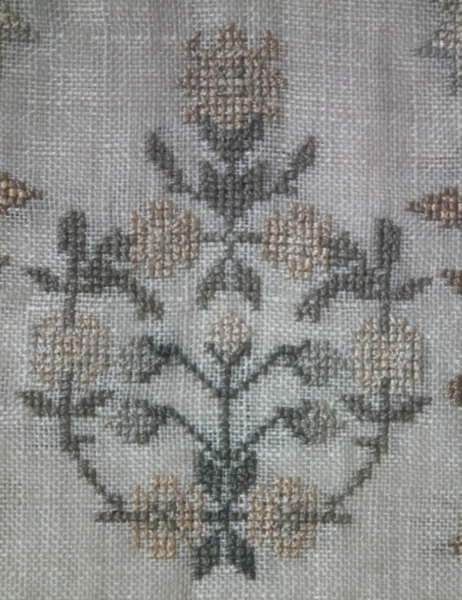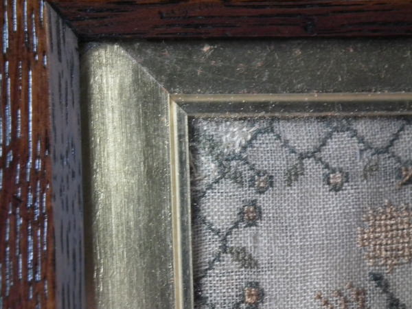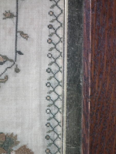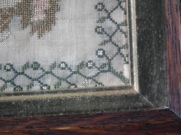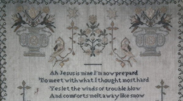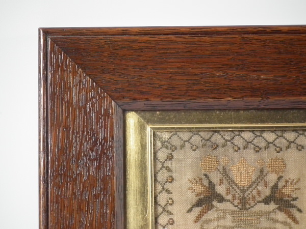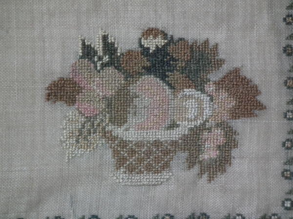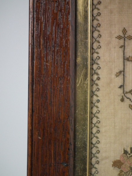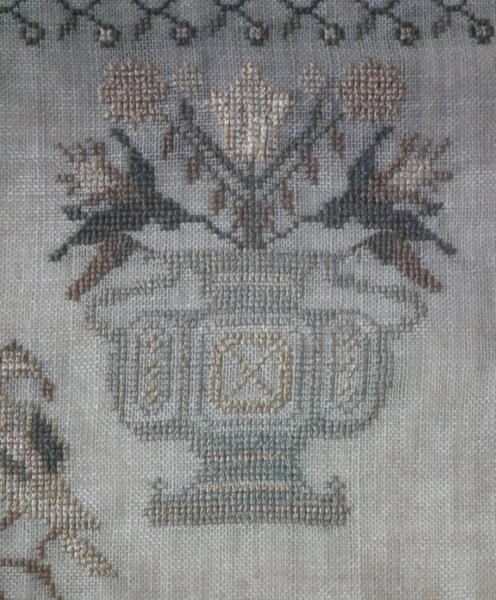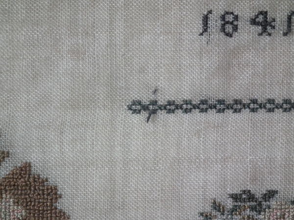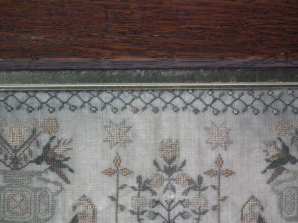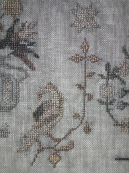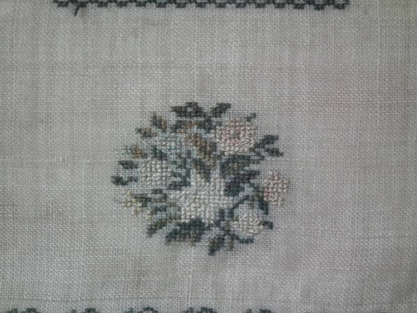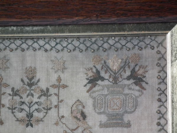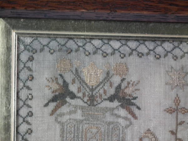 The sampler is worked in silk on linen ground, in cross stitch throughout.