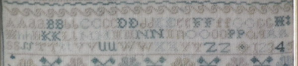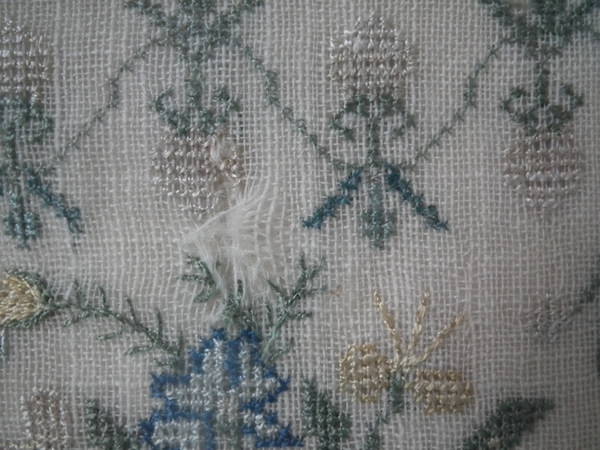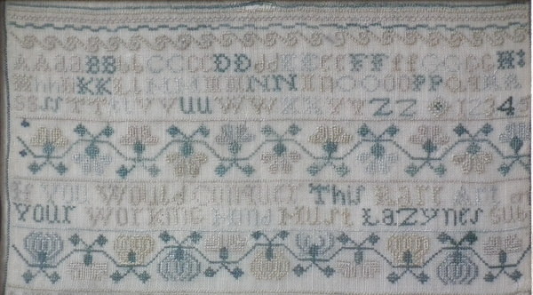 The sampler is worked in silk on linen ground, in a variety of stitches.