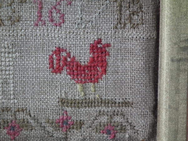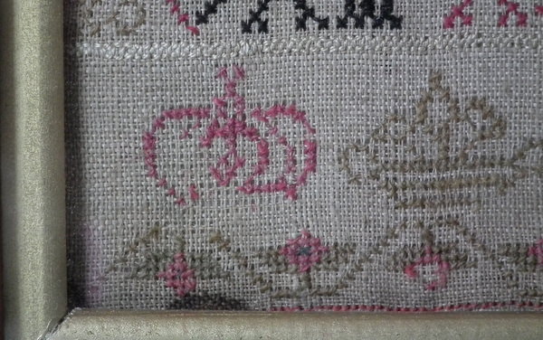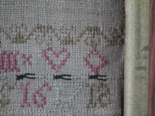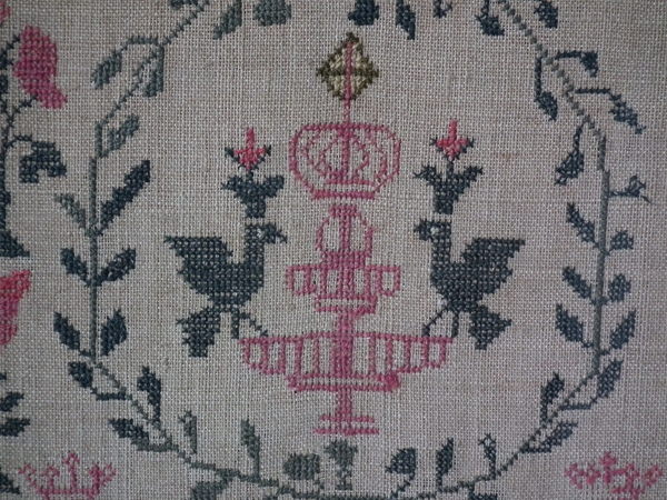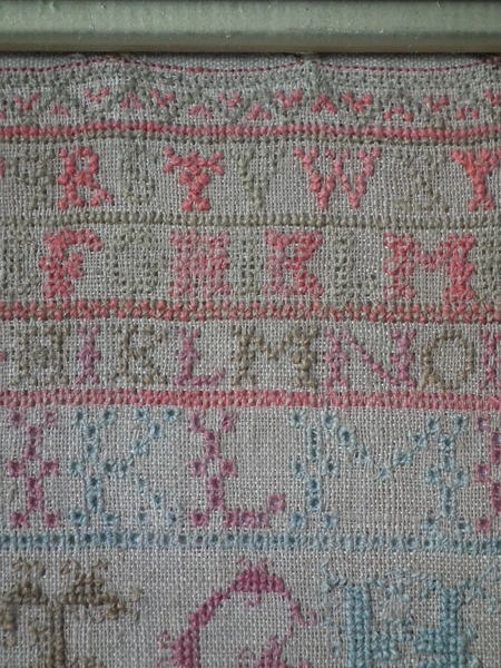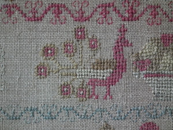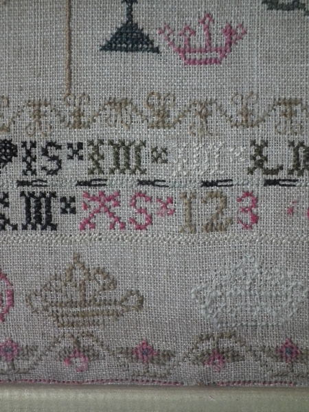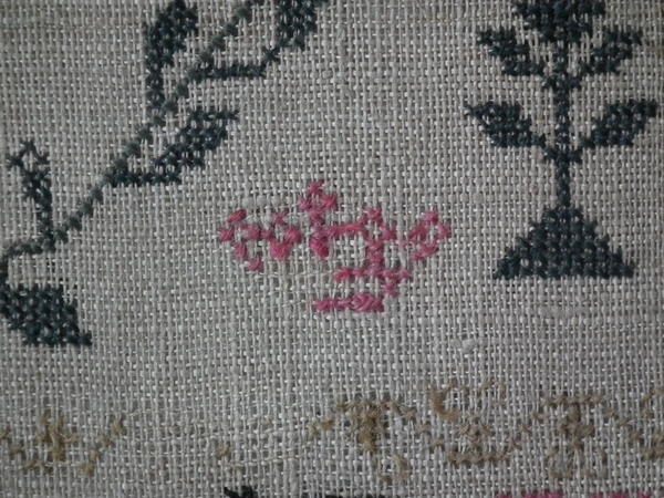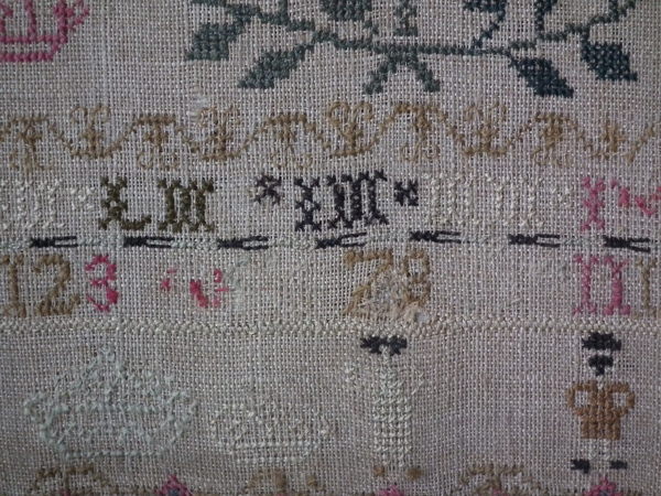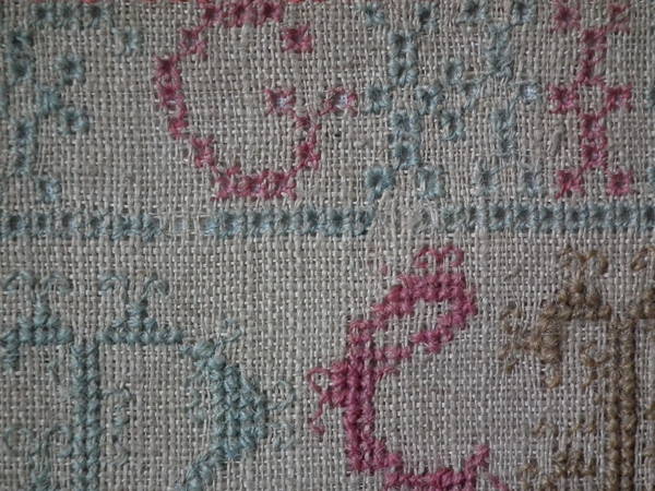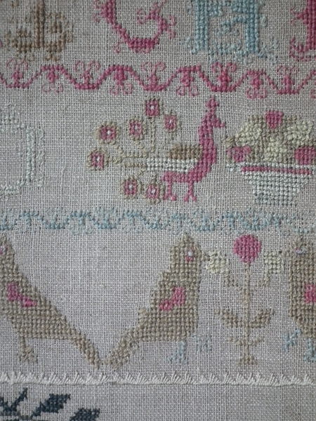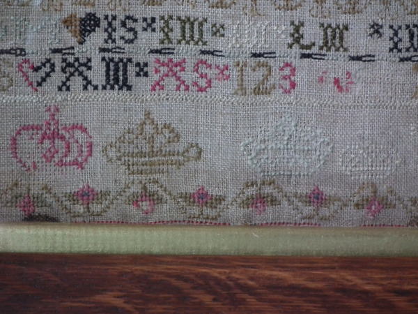 The sampler is worked in silk and fine wool on linen ground, in a variety of stitches.