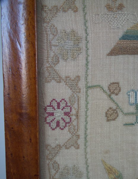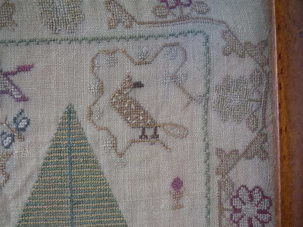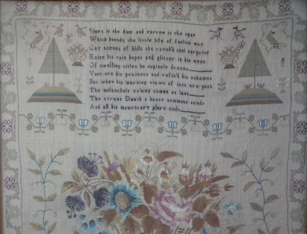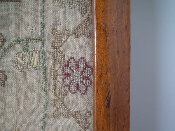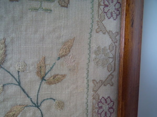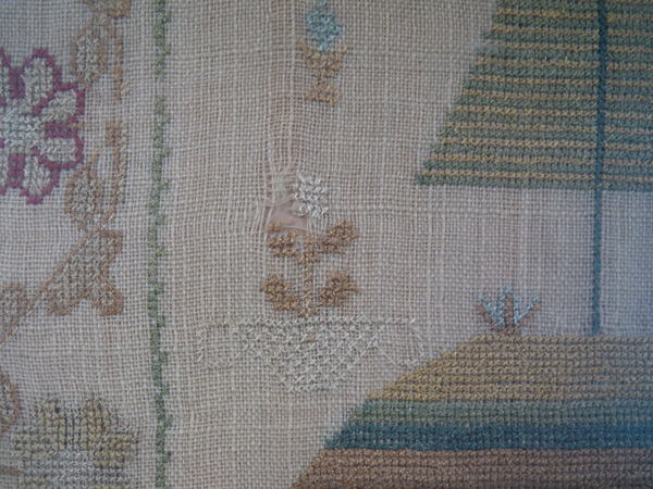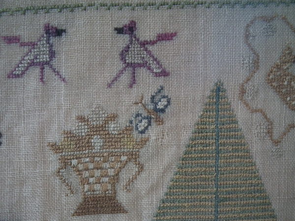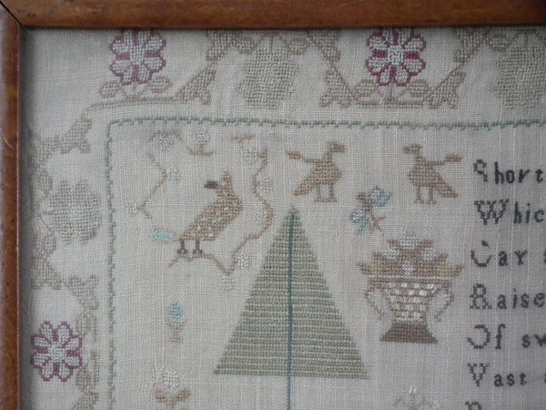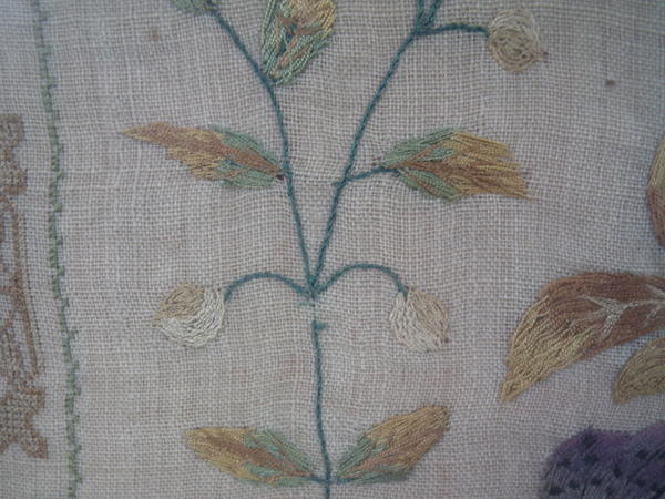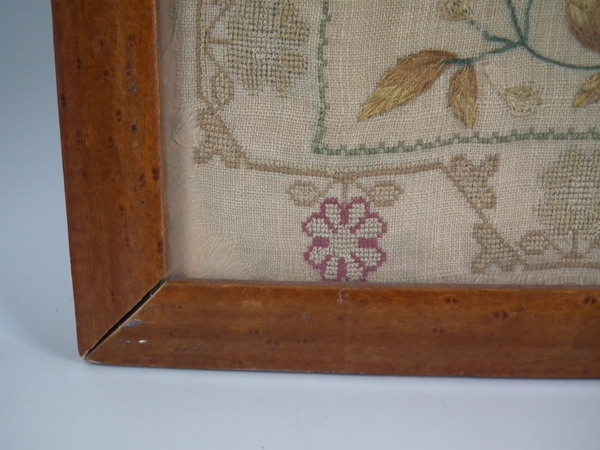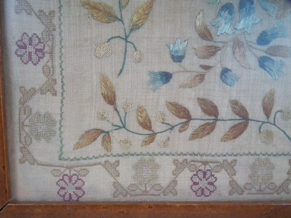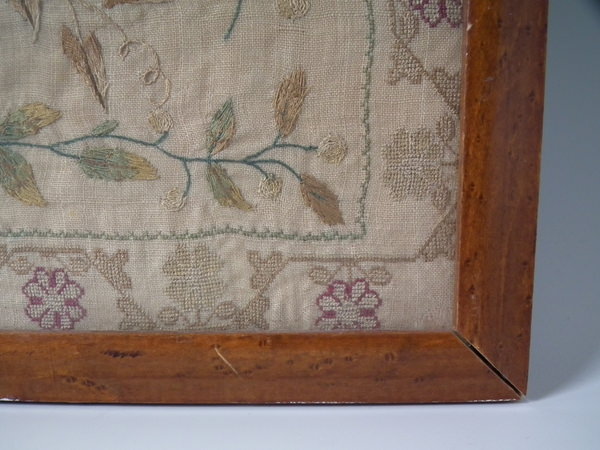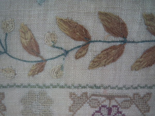 The sampler is worked in silk on linen ground, in a variety of stitches.