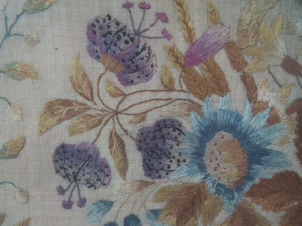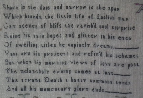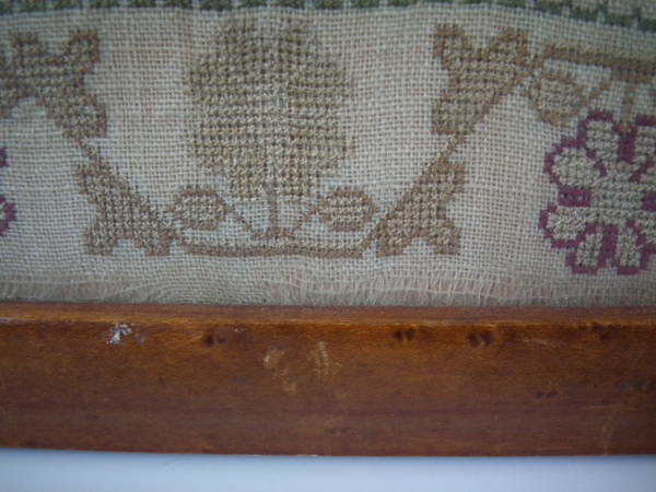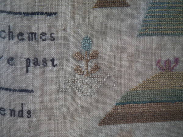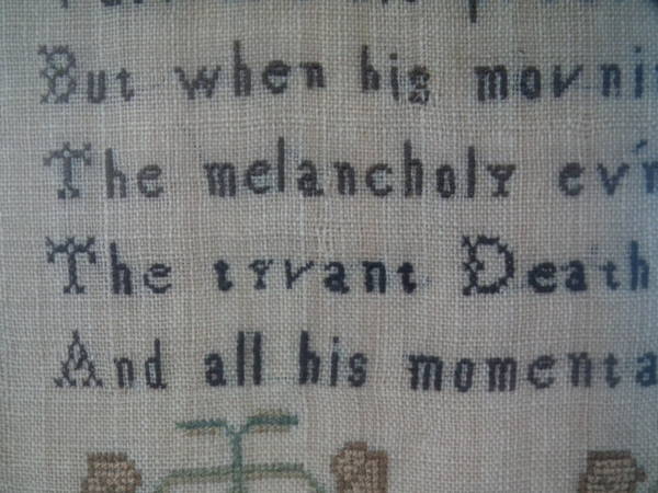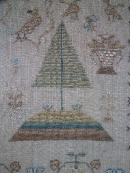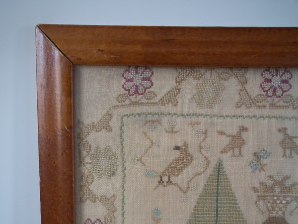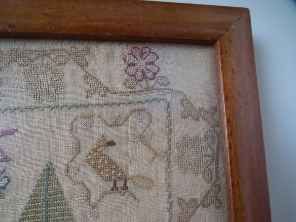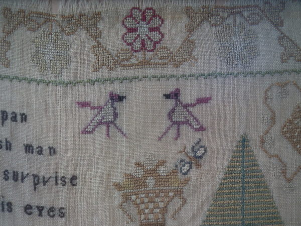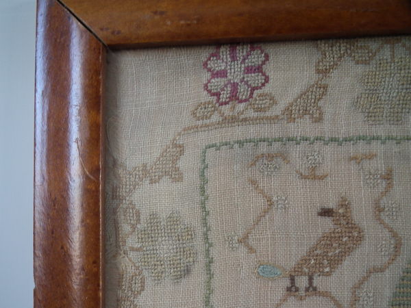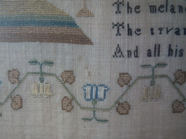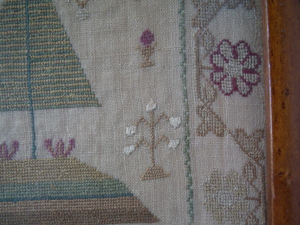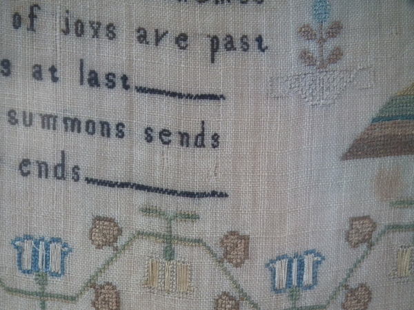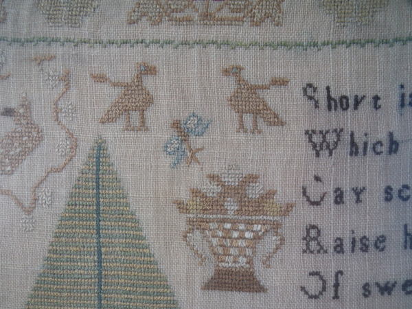 The sampler is worked in silk on linen ground, in a variety of stitches.