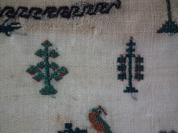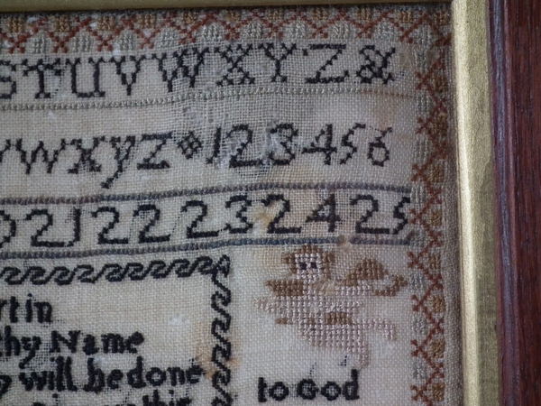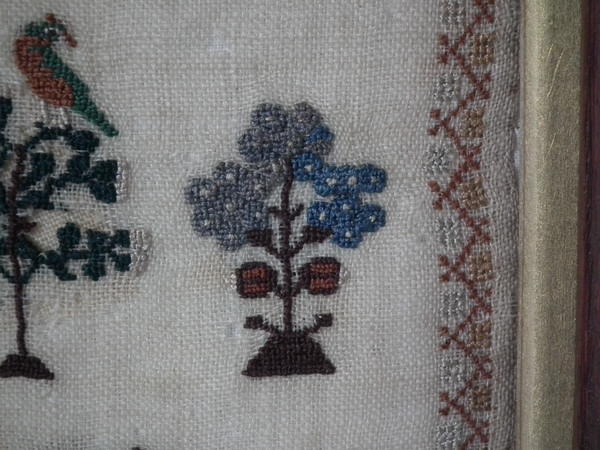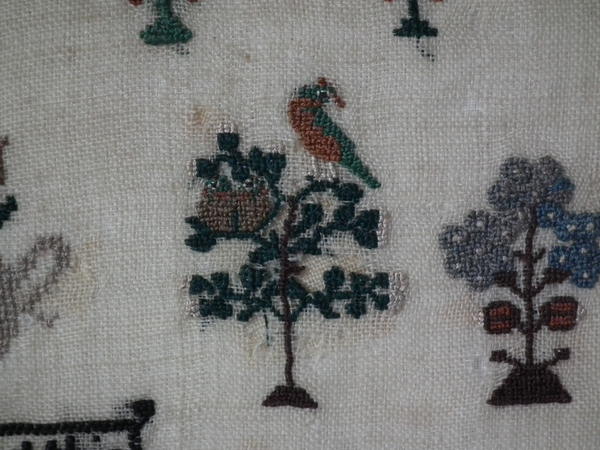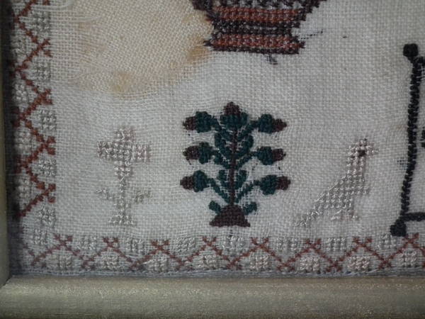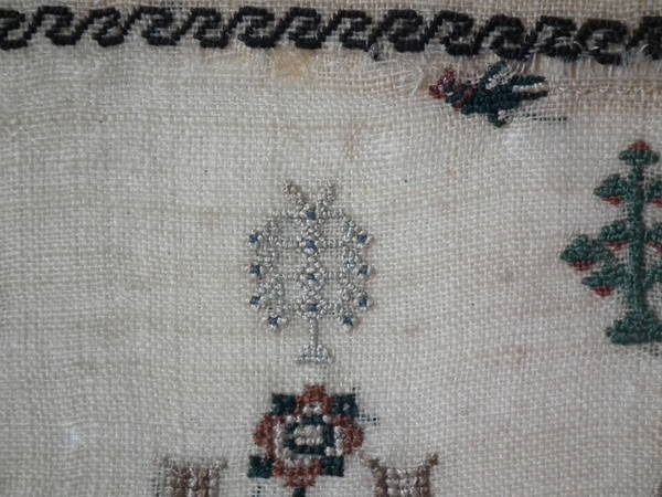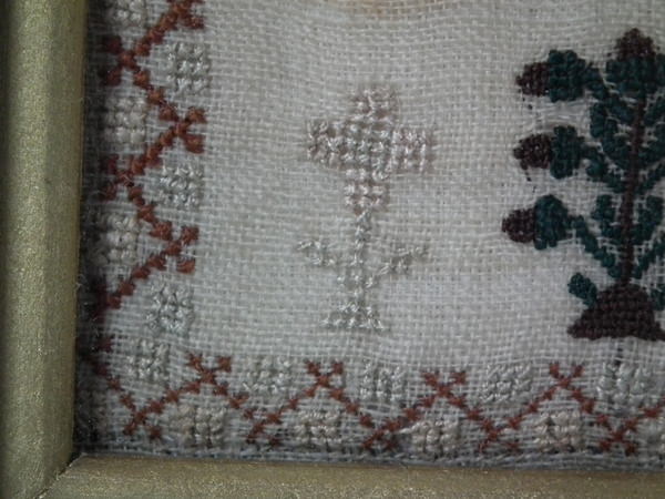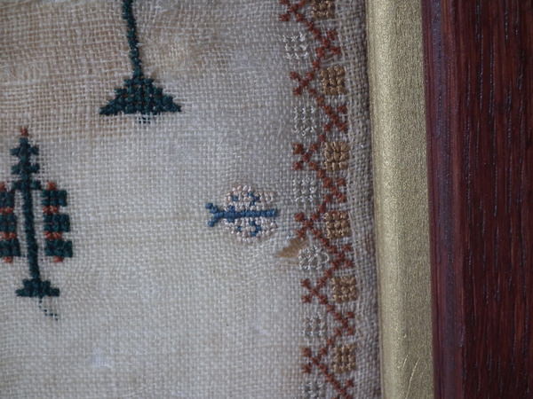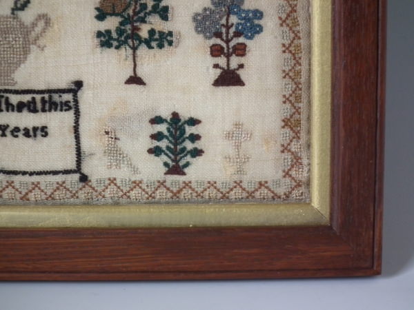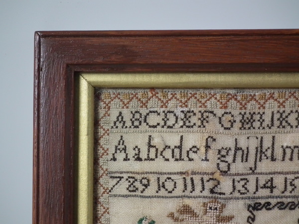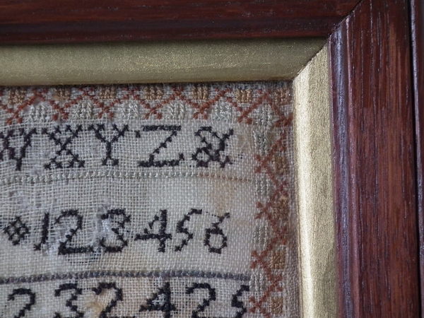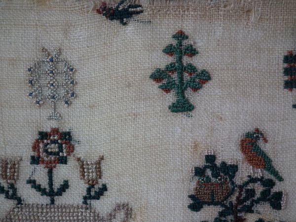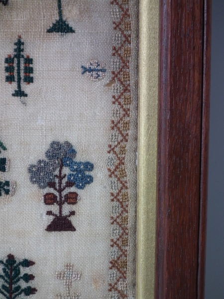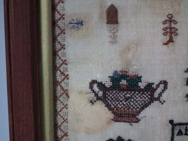 The sampler is worked in silk on linen ground, in cross stitch throughout.