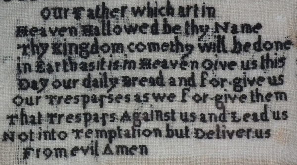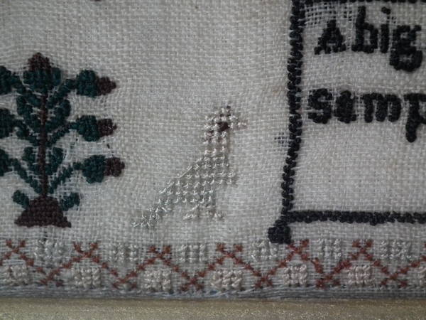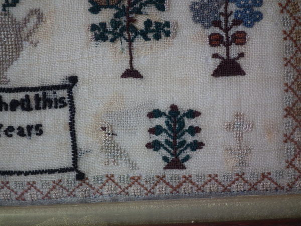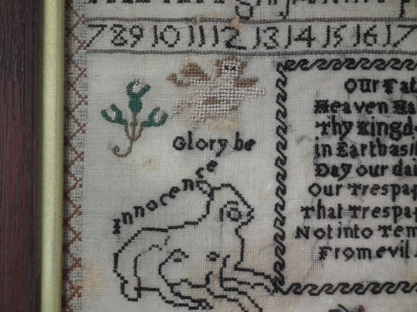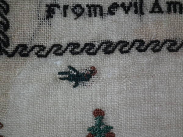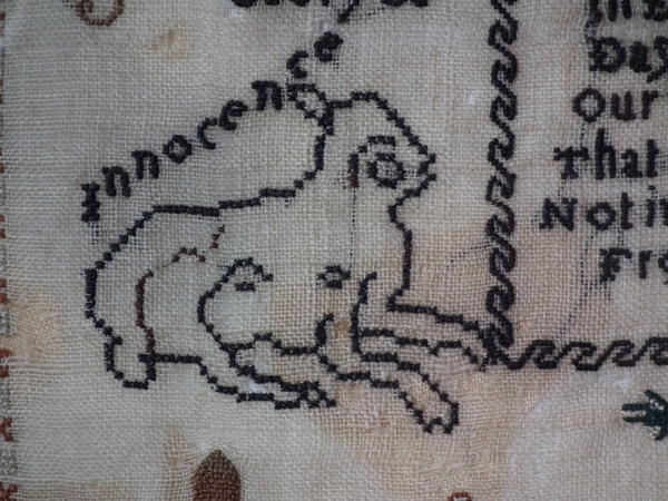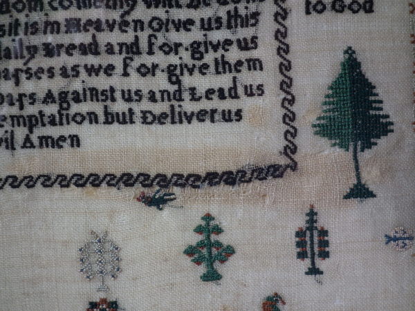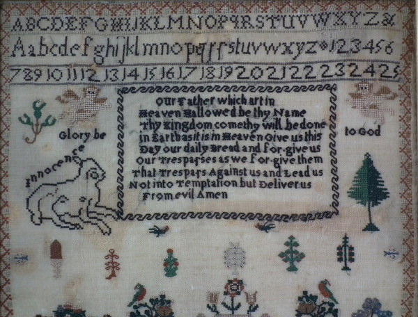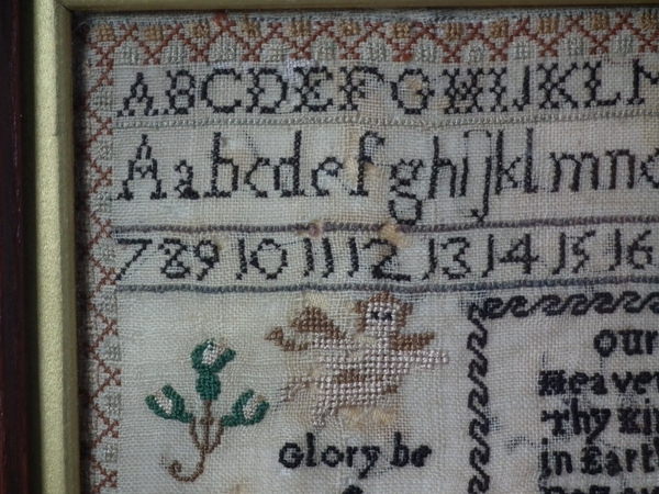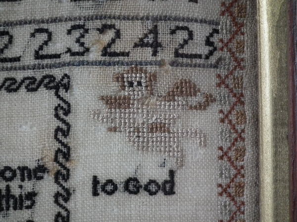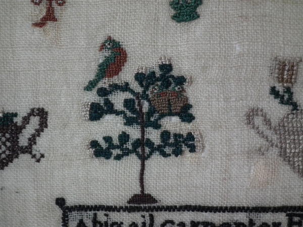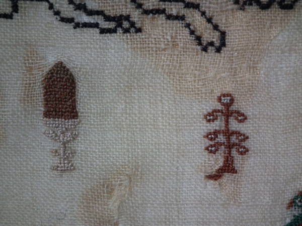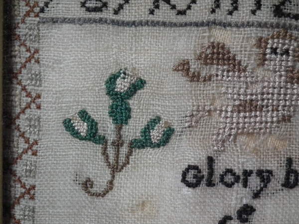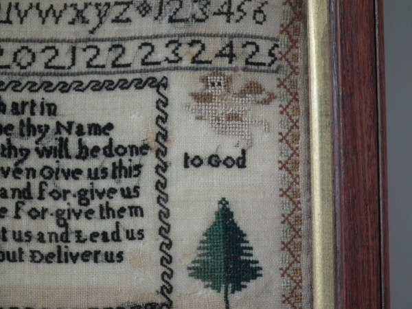 The sampler is worked in silk on linen ground, in cross stitch throughout.