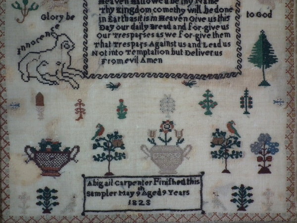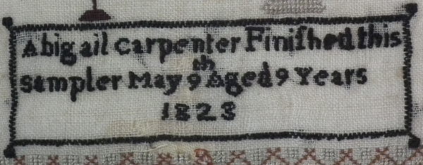 George IV, dated 1823. 12.25ins by 12.25ins wide. 1823 Sampler by Abigail Carpenter. Framed in an old wood frame with gilt slip and glass.