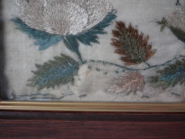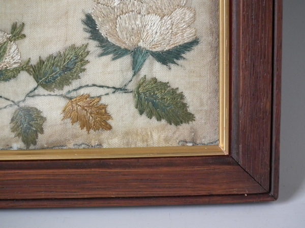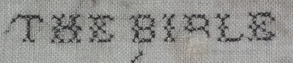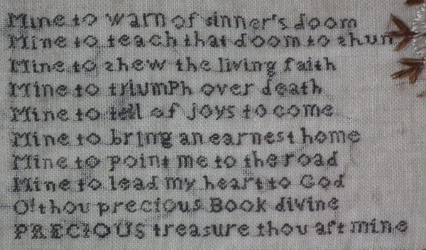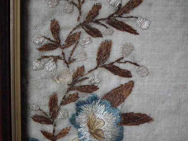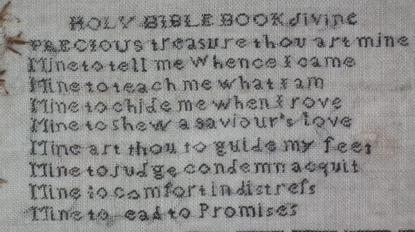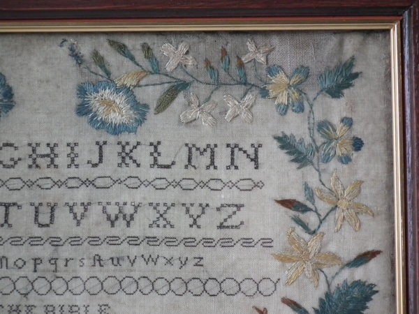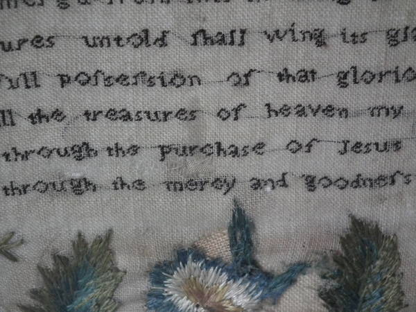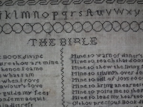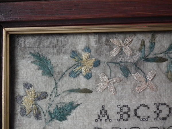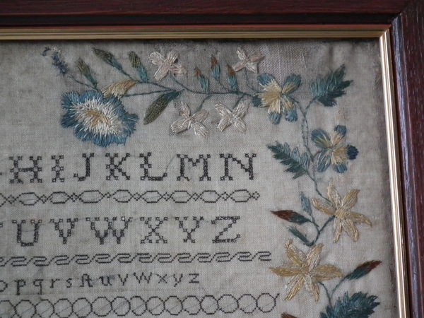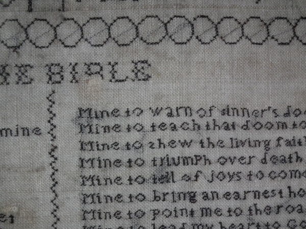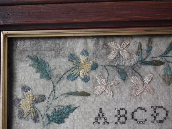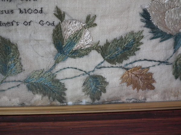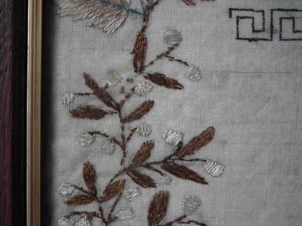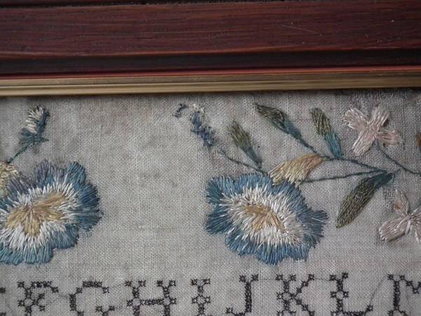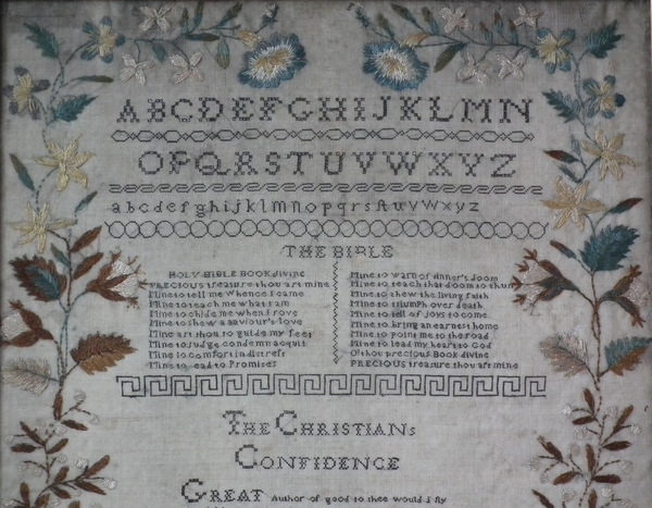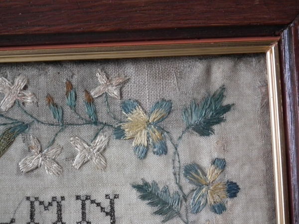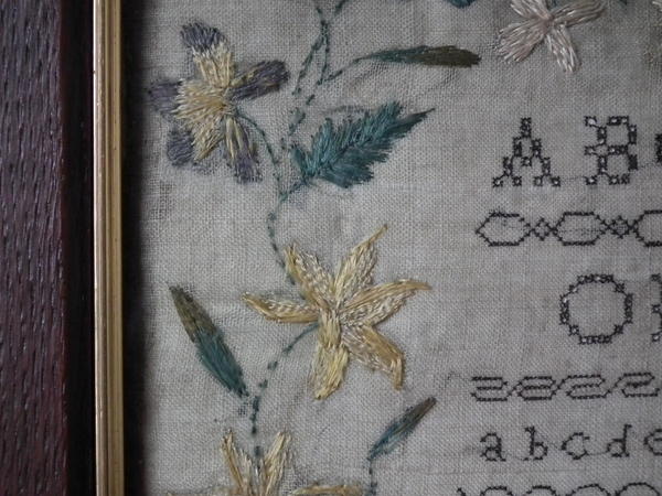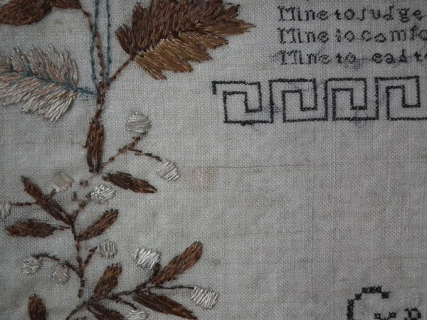 The sampler is worked in a silk-like thread on linen ground, in a variety of stitches.