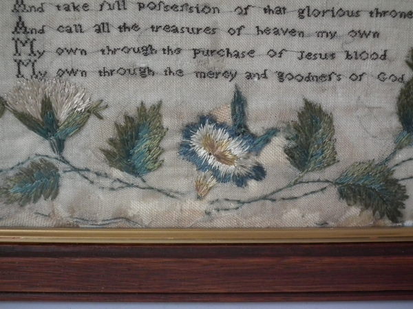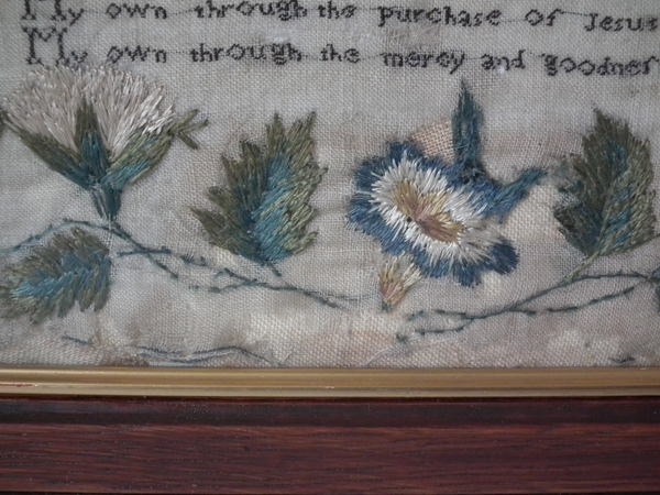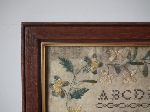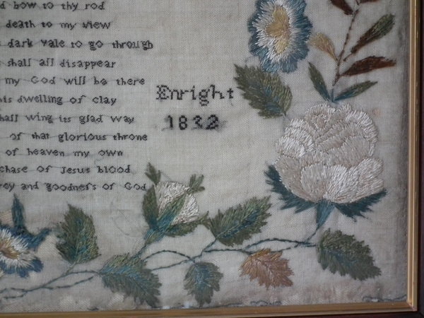 William IV, dated 1832. 20ins by 14ins wide. 1832 Religious Irish Sampler by Mary Anne Enright. Framed in an old wood frame with rippled, dimpled, old glass.