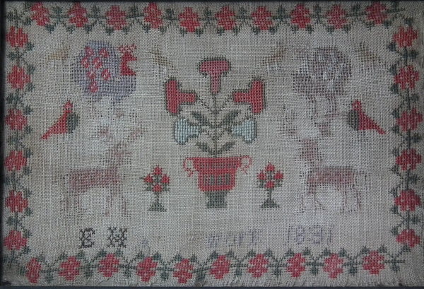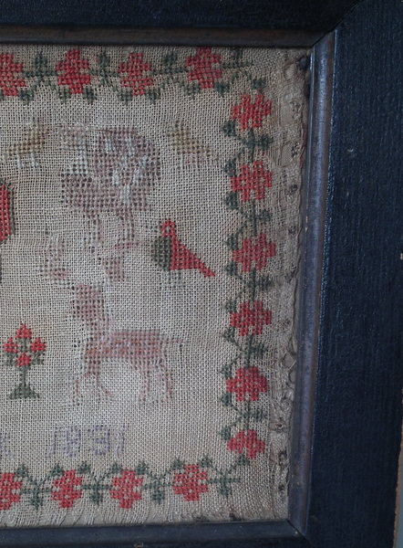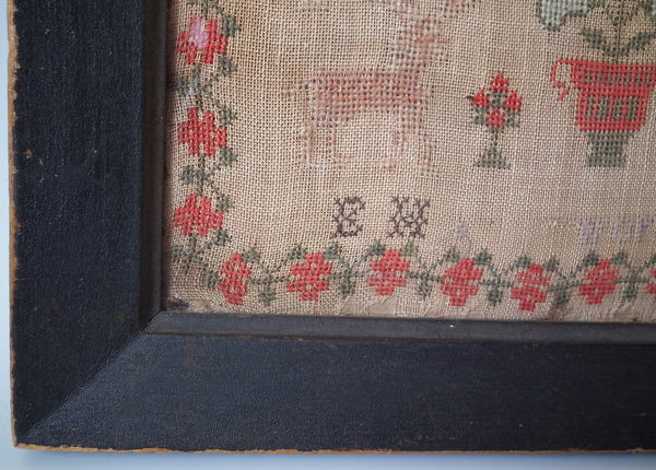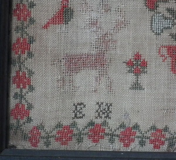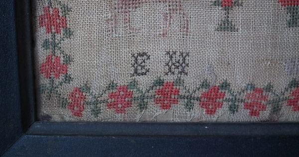 William IV, dated 1831. 7.5ins high by 11.5ins wide. 1831 Motif Sampler by E H. Framed in an old, possibly original wood frame with glass.