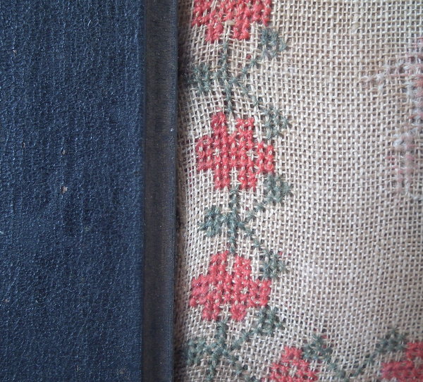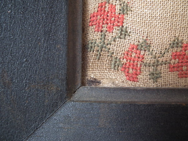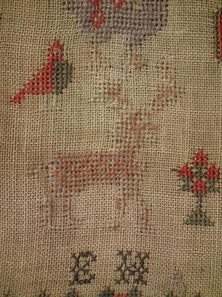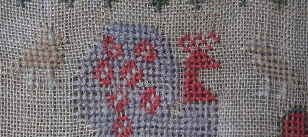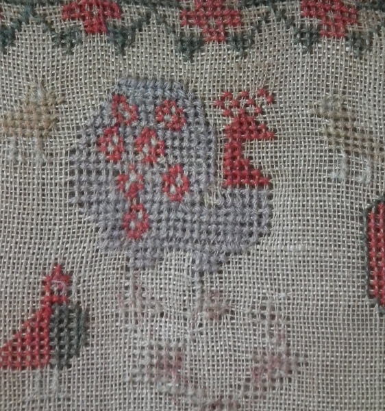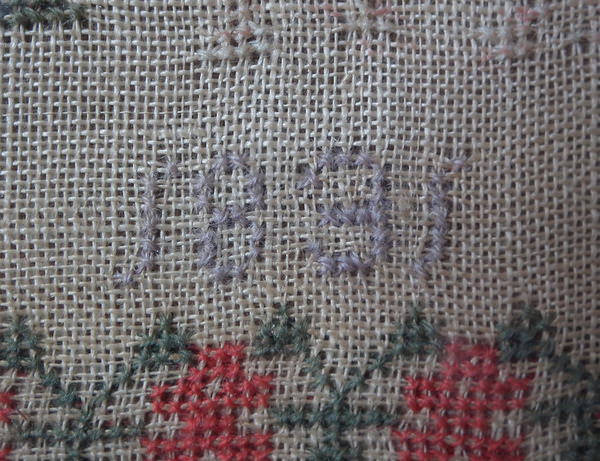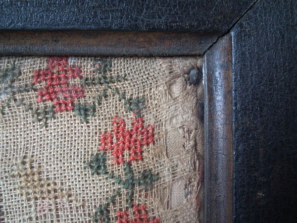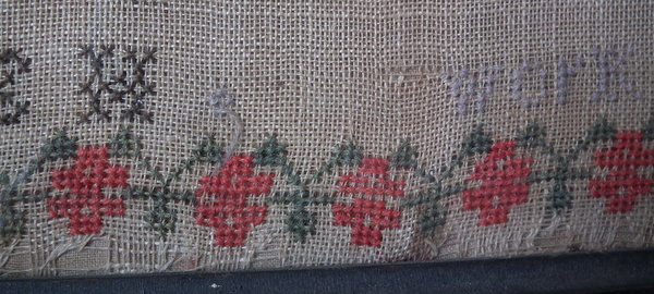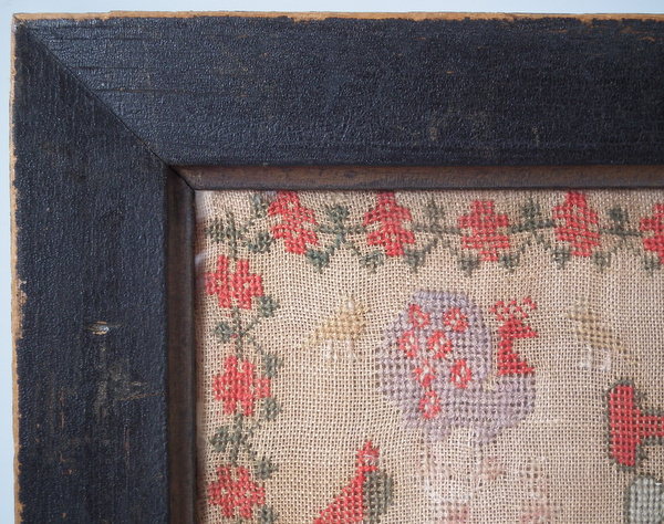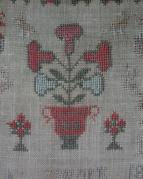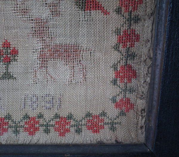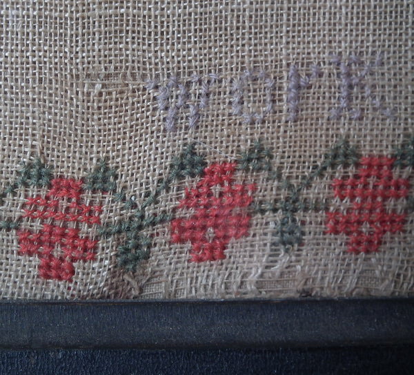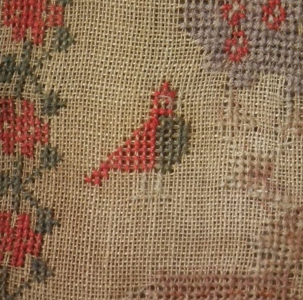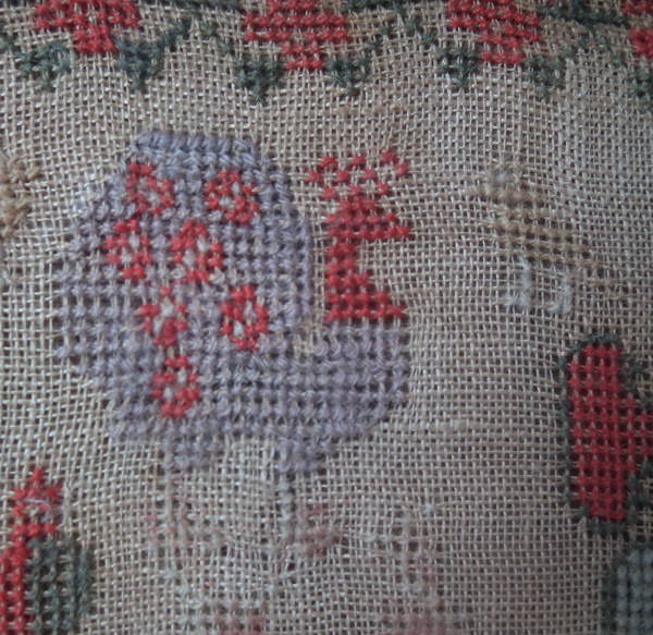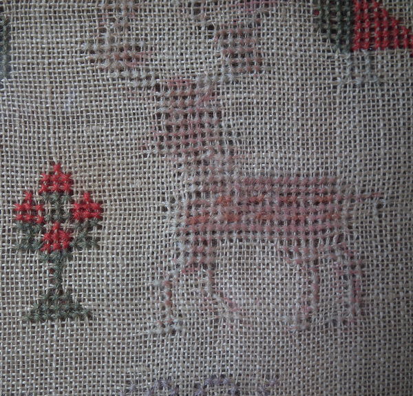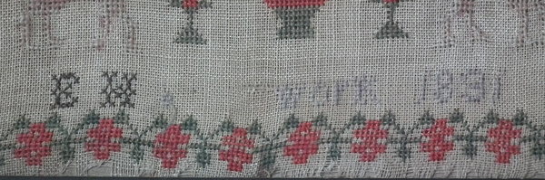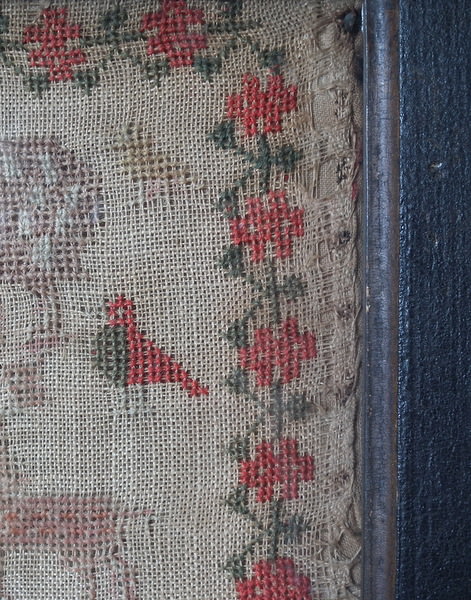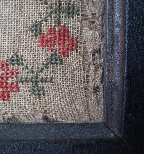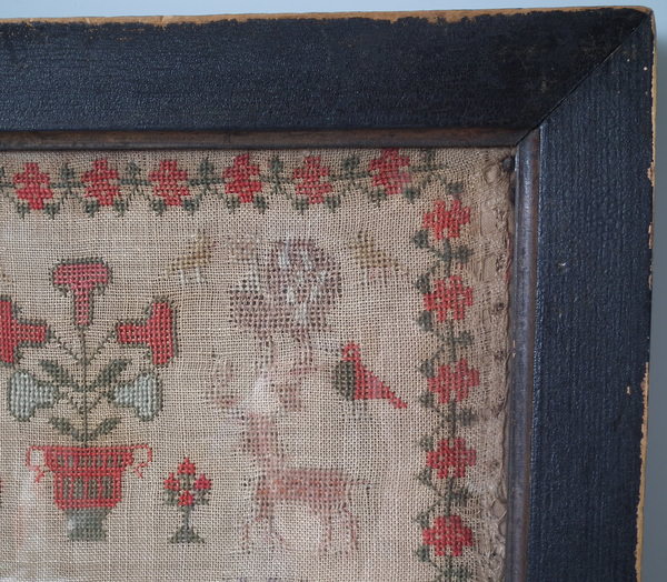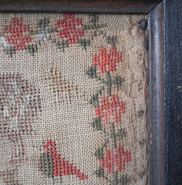 The sampler is worked in cotton and fine wool on canvas ground, in cross stitch throughout.