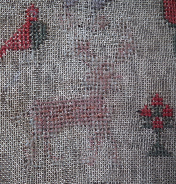 Colours are slightly faded, but still well defined. We think that the threads to the stags, peacocks and smaller birds have been retouched.