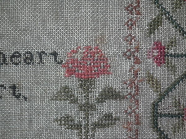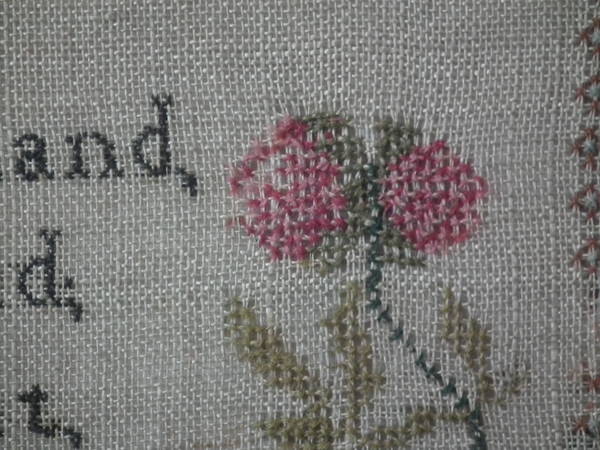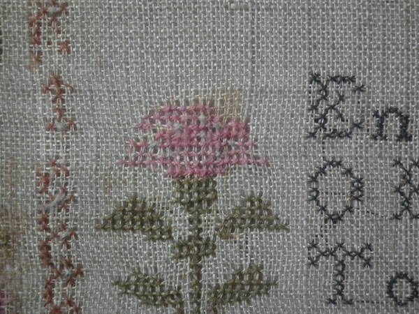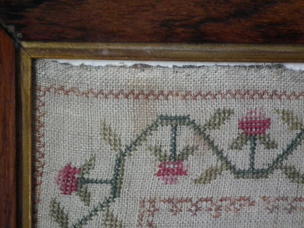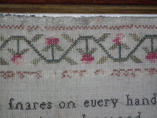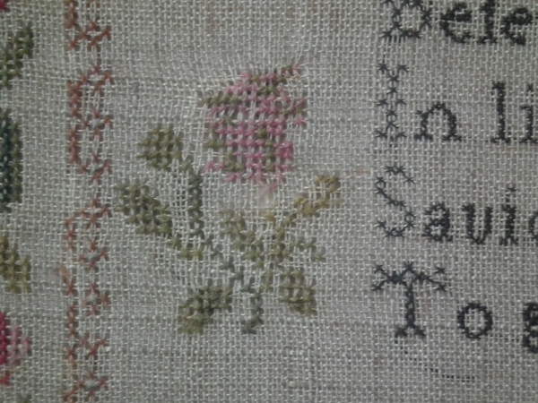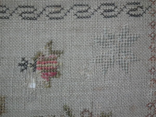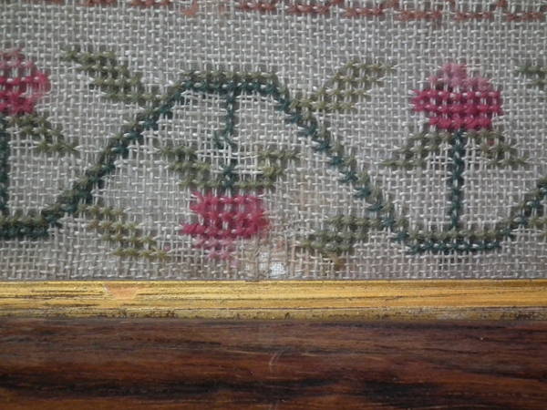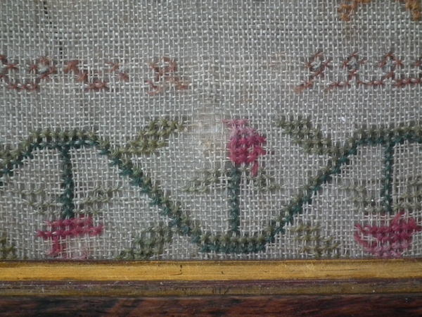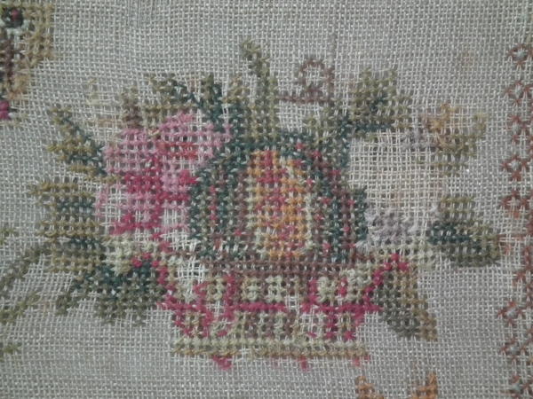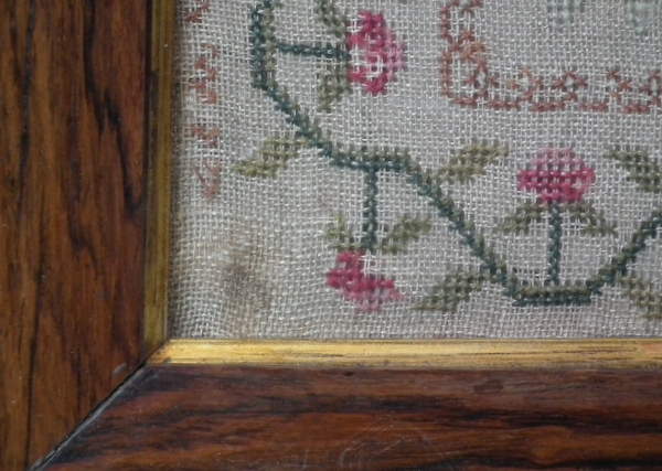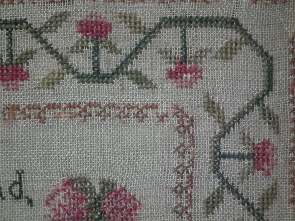 The sampler is worked in fine wool and cotton on canvas ground, in cross stitch throughout.