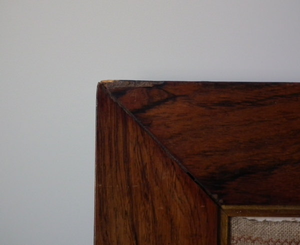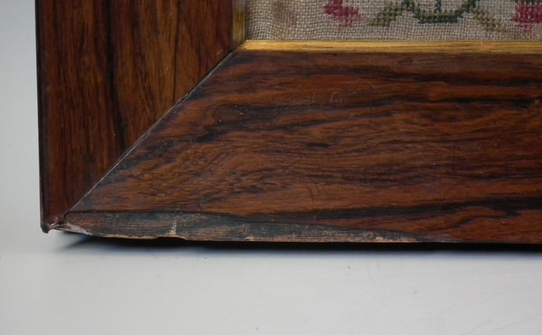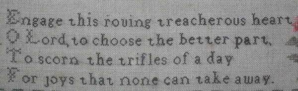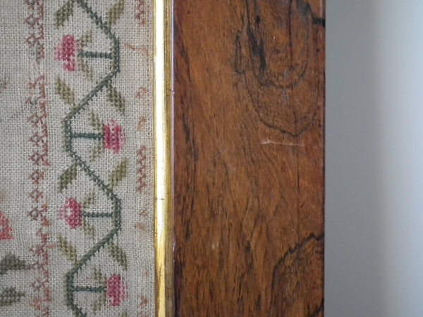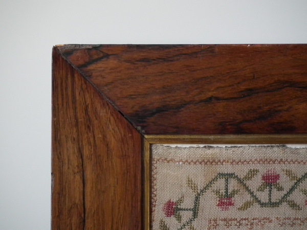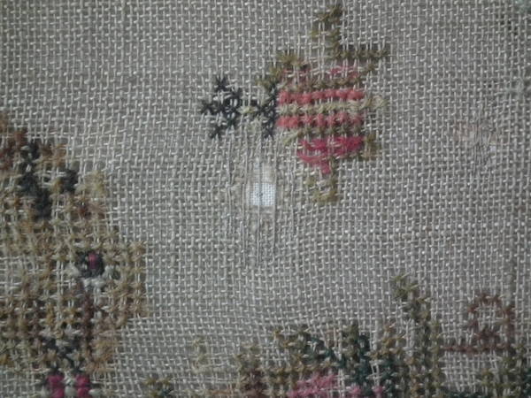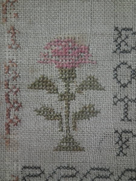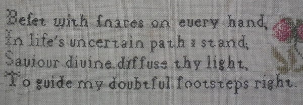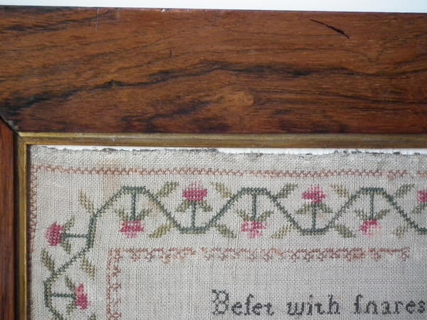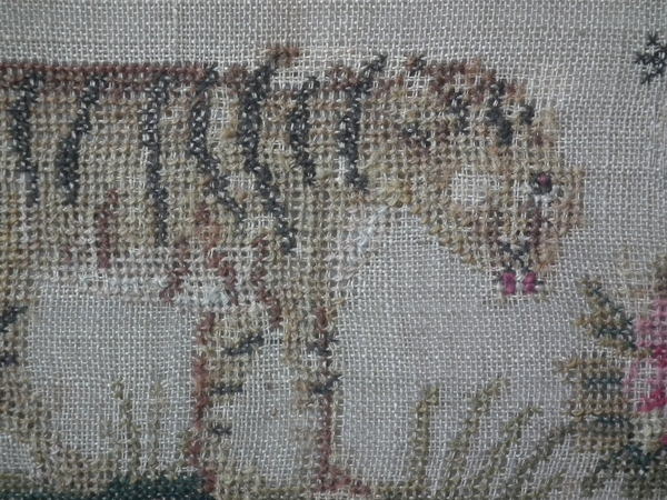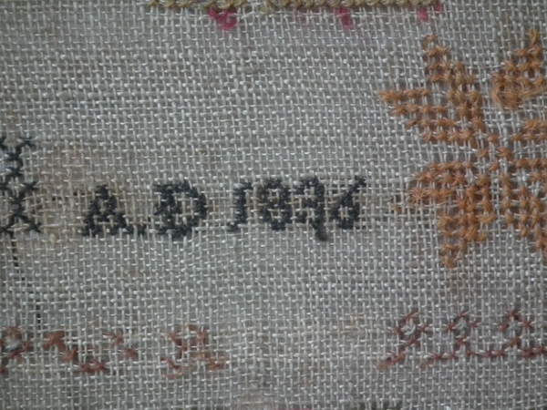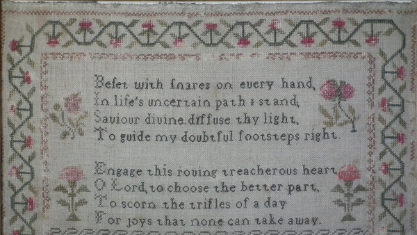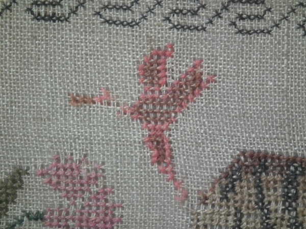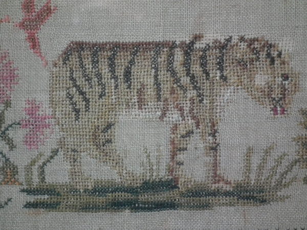 The sampler is worked in fine wool and cotton on canvas ground, in cross stitch throughout.