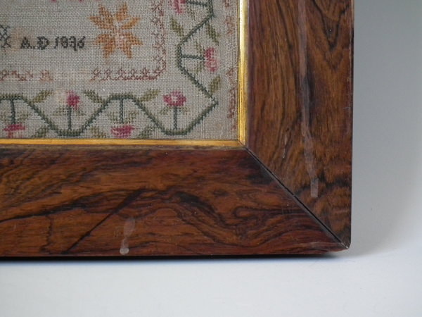 1836 Sampler by Elizabeth Smith. Framed in an old wood frame with gilt slip and glass.