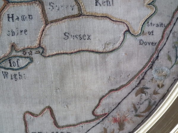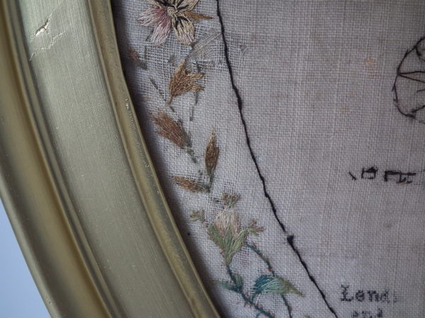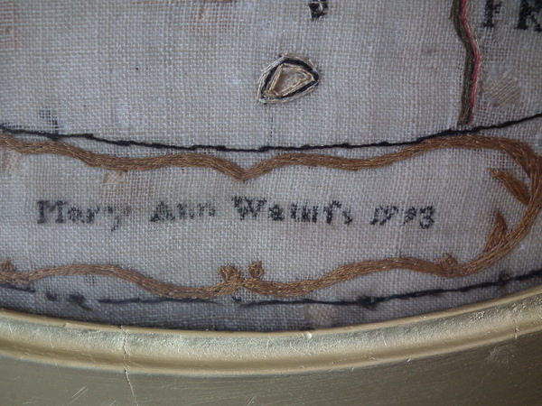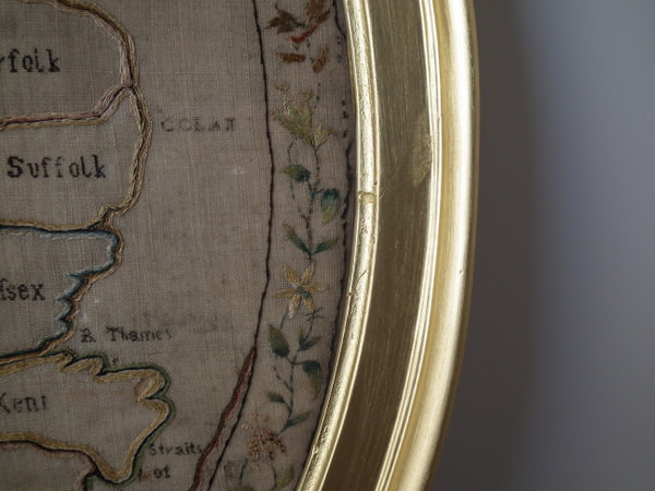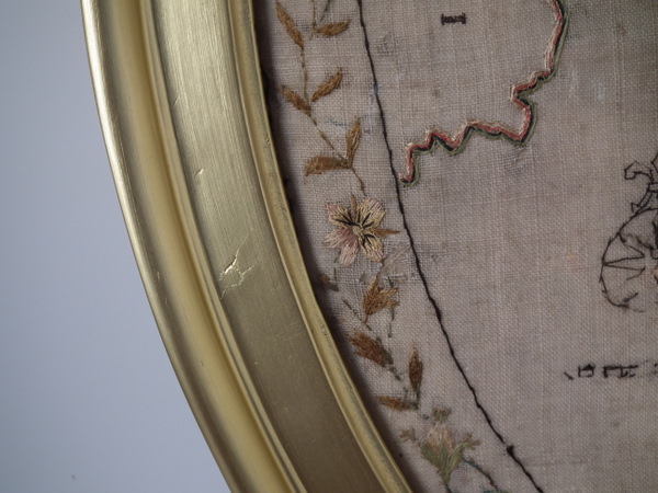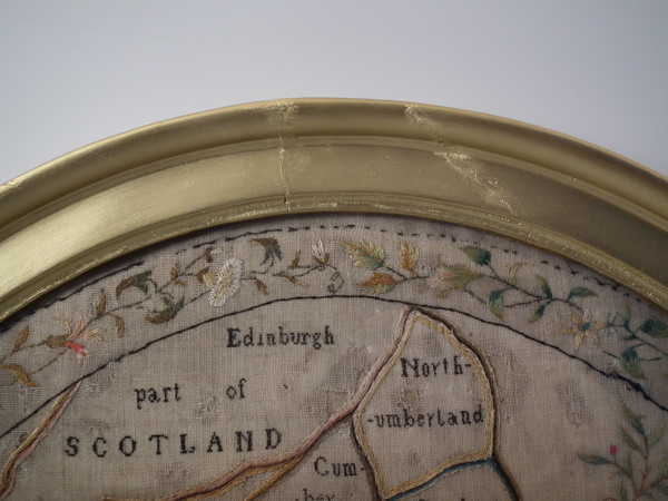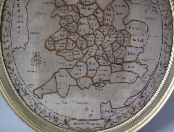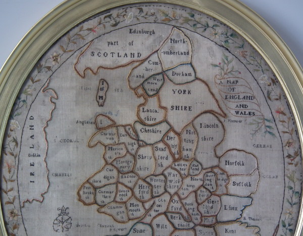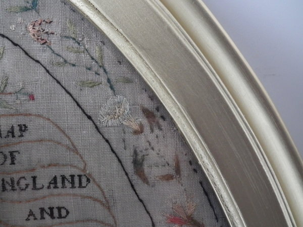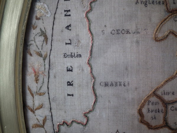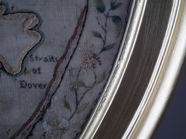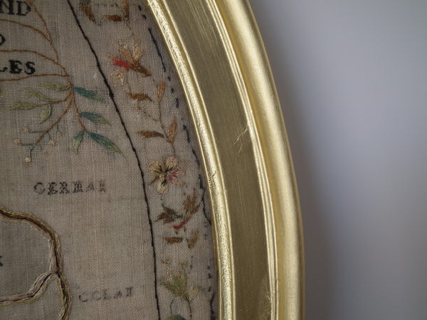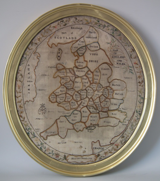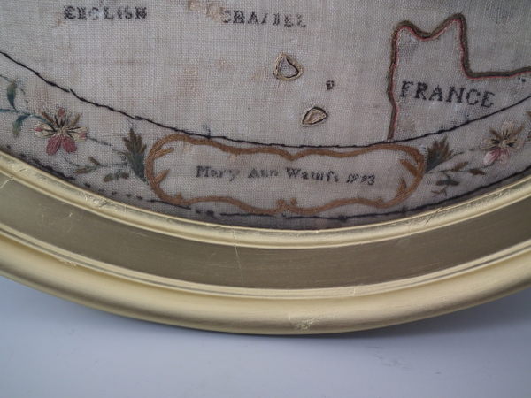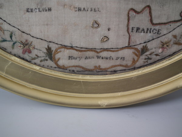 George III, dated 1793. 20.5ins high by 18ins wide. 1793 Map Sampler by Mary Ann Watkiss. Framed in a restored old oval wooden frame, with rippled, old glass.