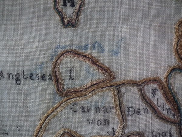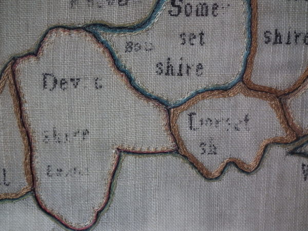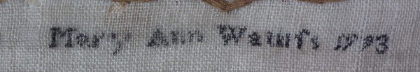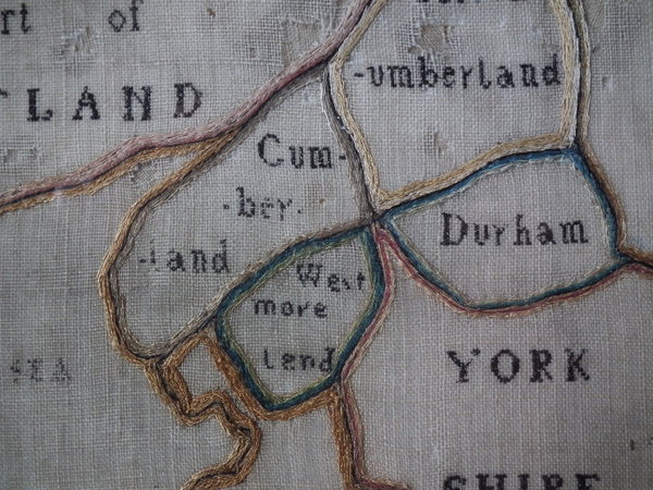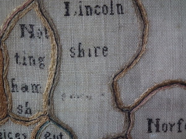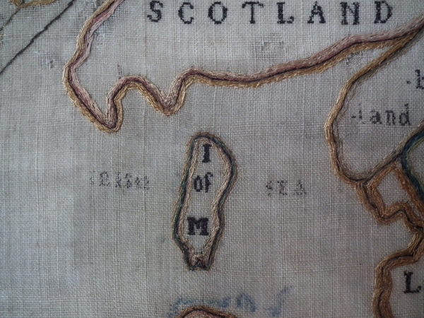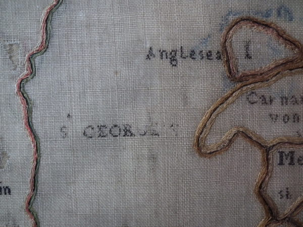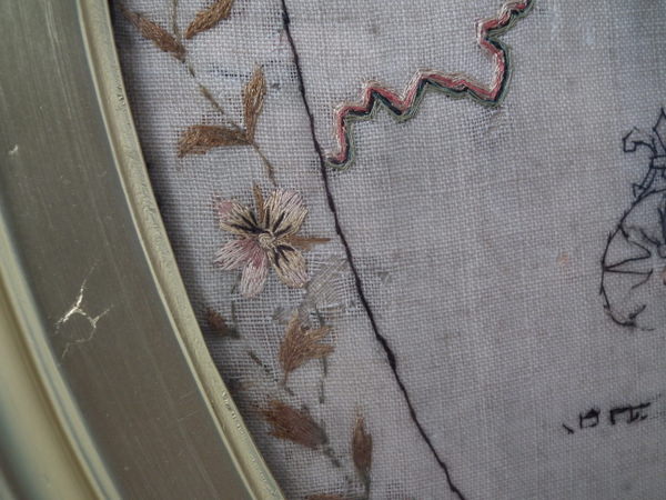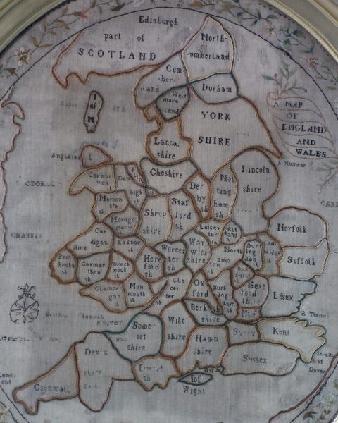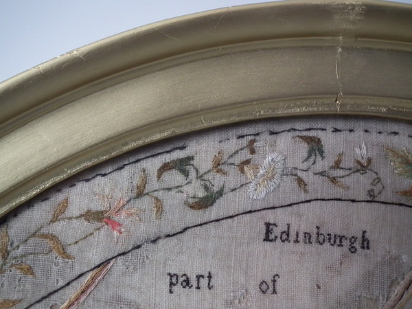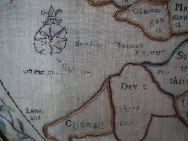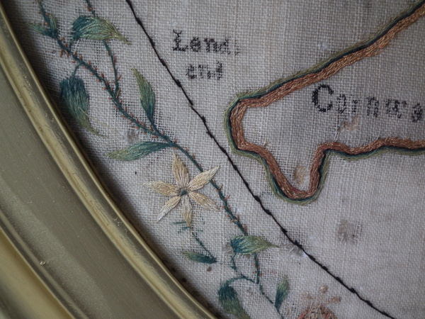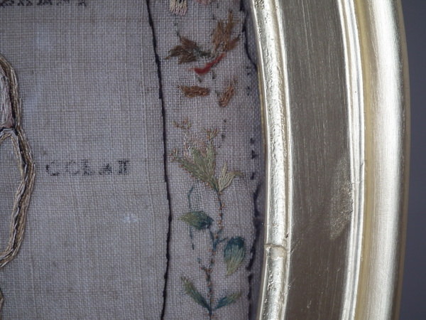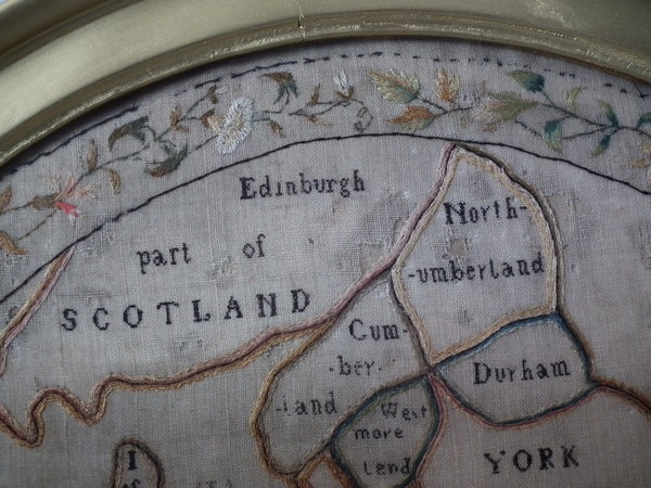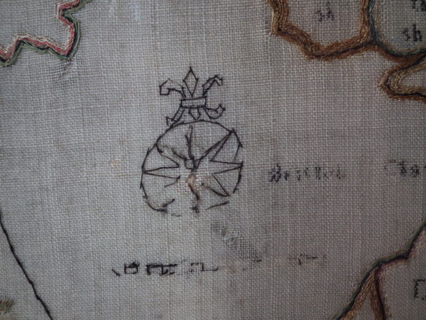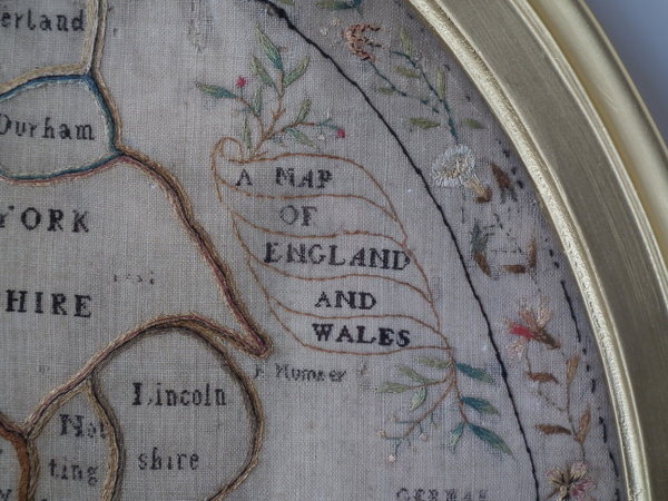 George III, dated 1793. 20.5ins high by 18ins wide. 1793 Map Sampler by Mary Ann Watkiss. Framed in a restored old oval wooden frame, with rippled, old glass.