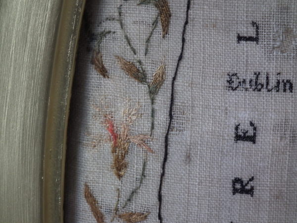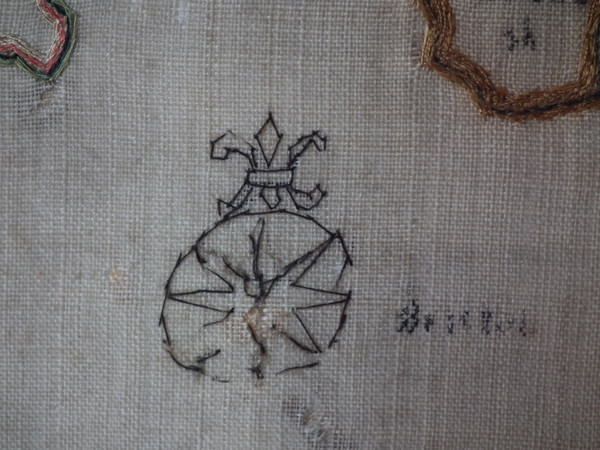The sampler is worked in silk on linen ground, in a variety of stitches.