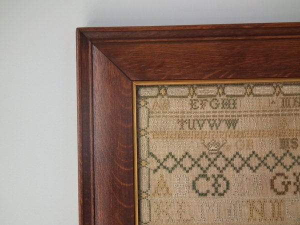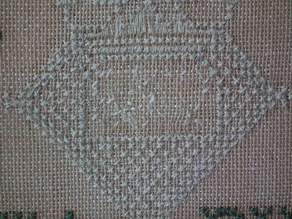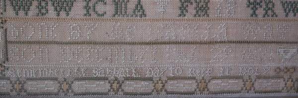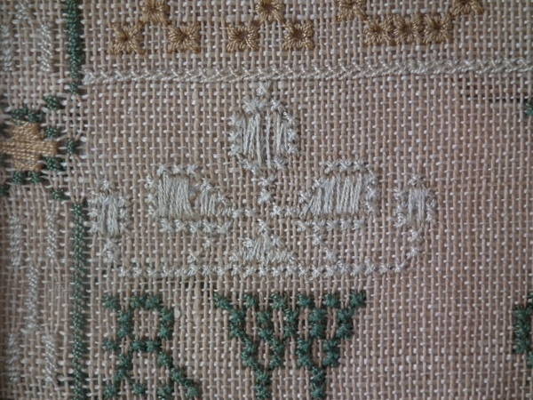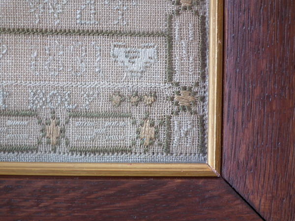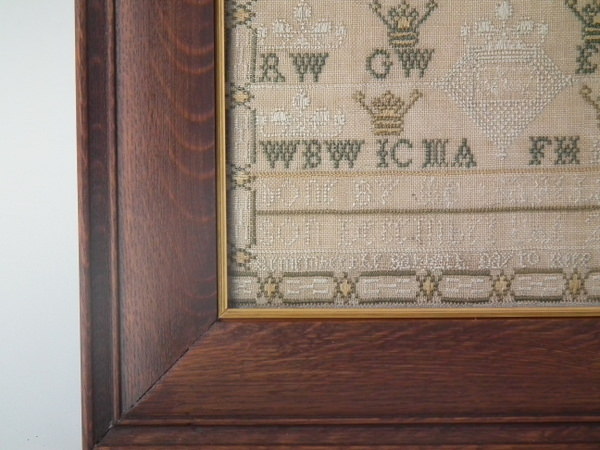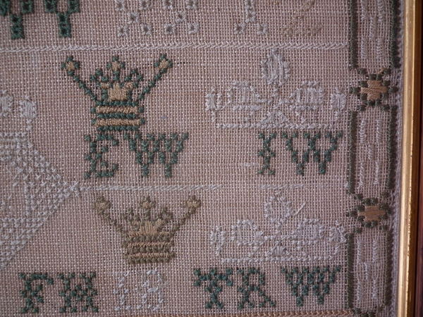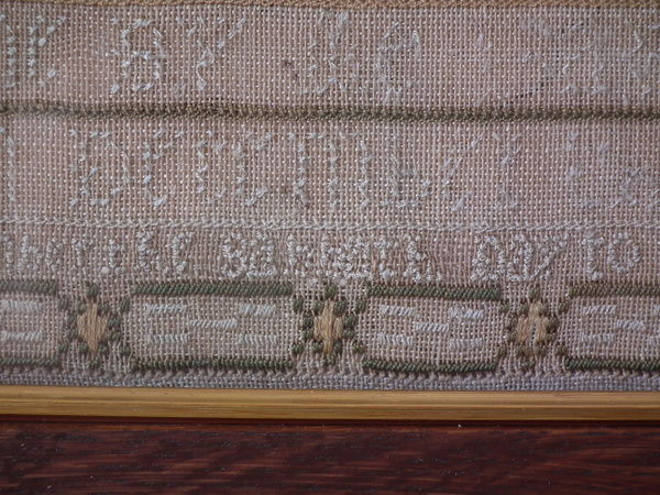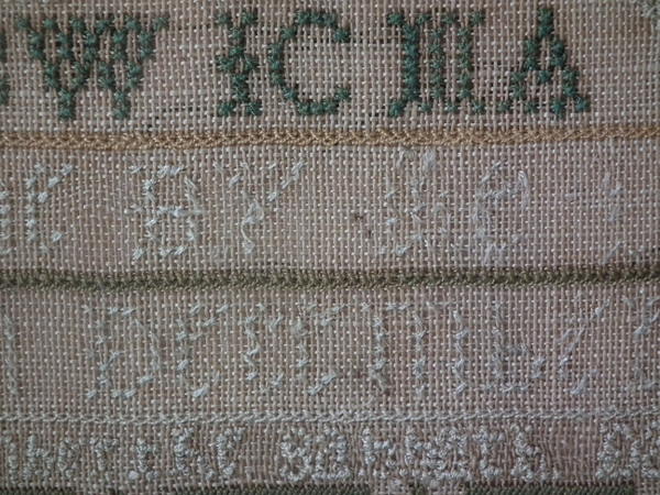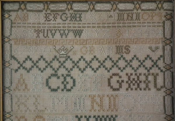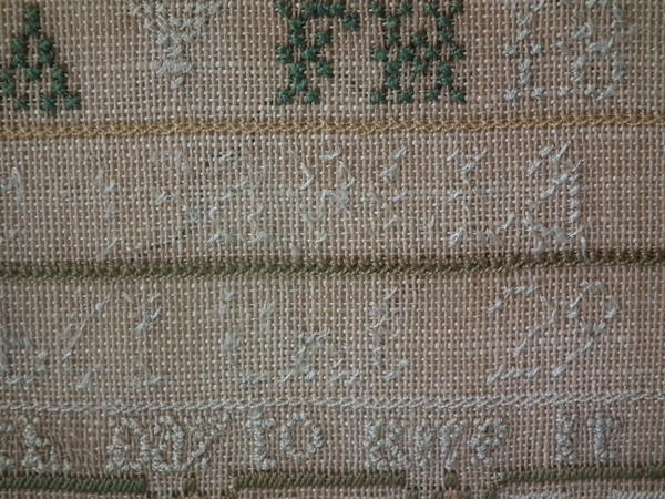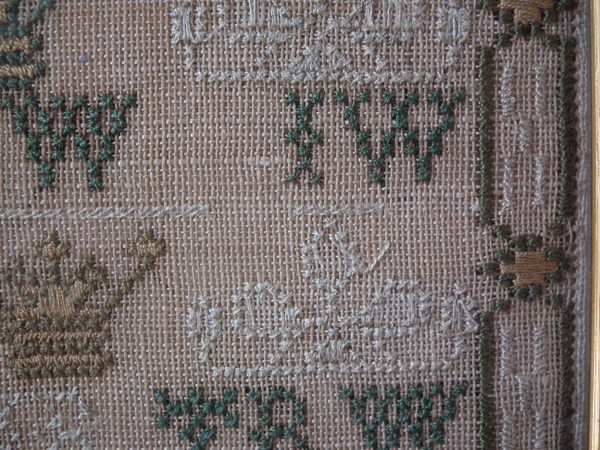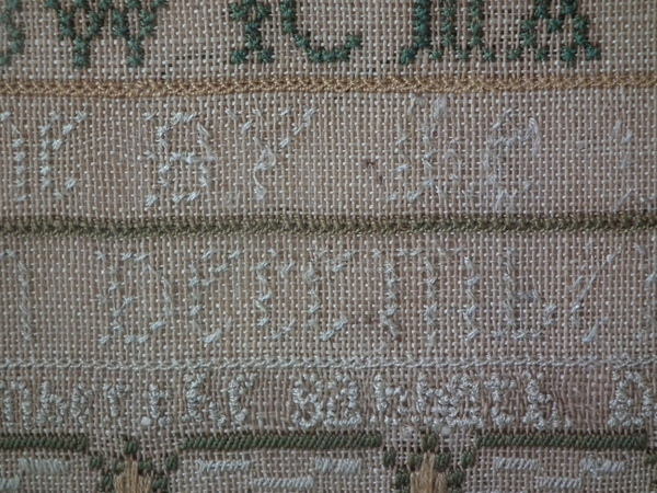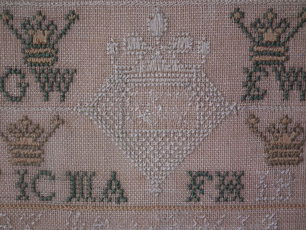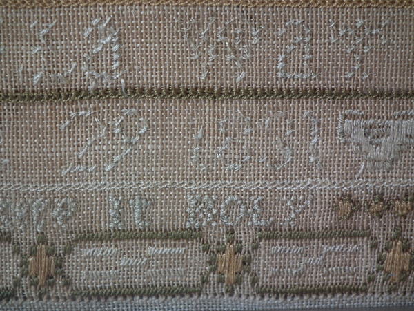 The sampler is worked in silk on linen ground, in a variety of stitches including Algerian eye.